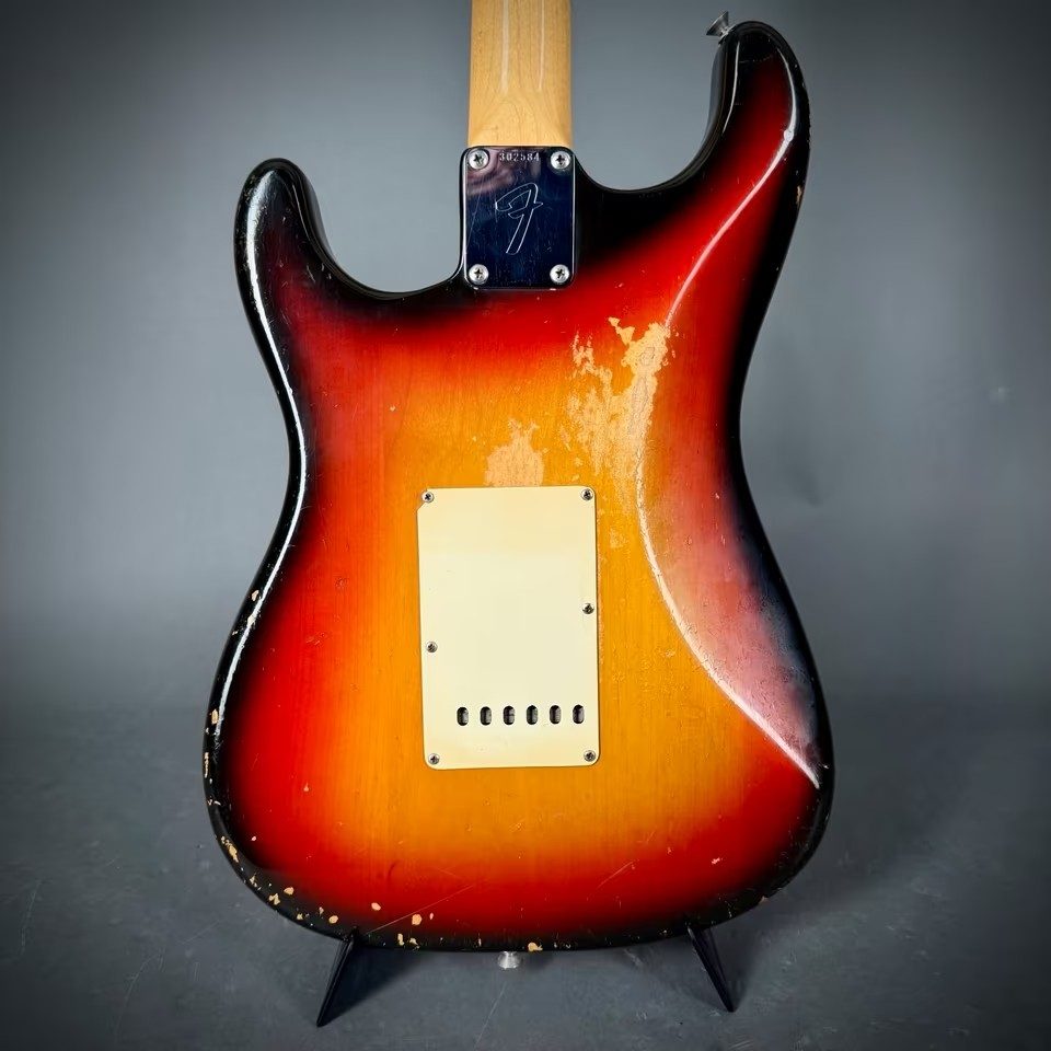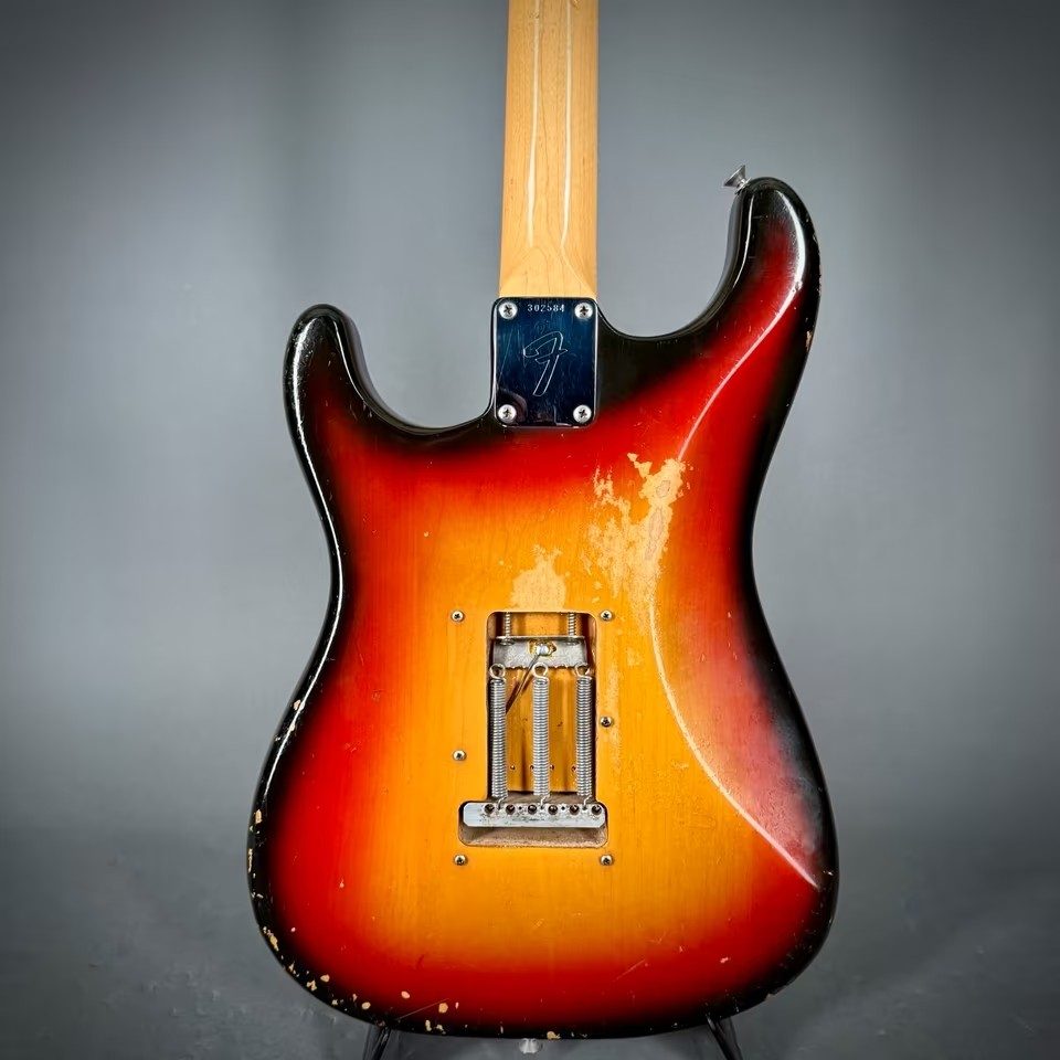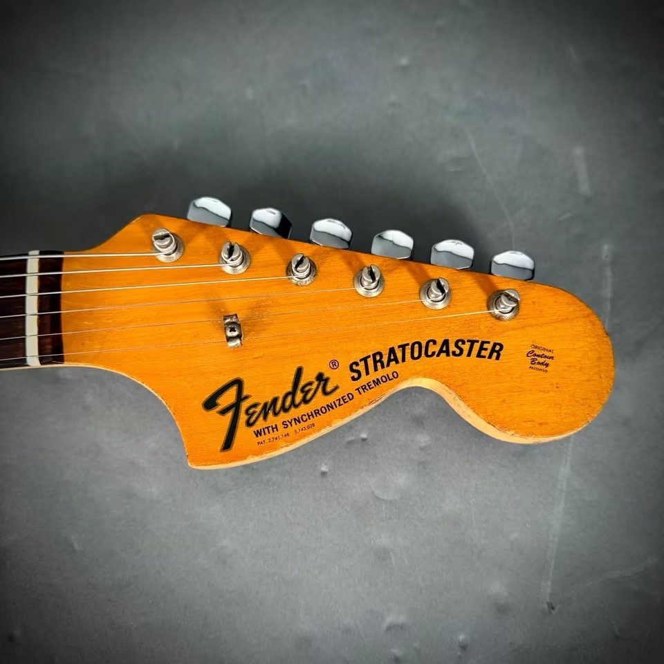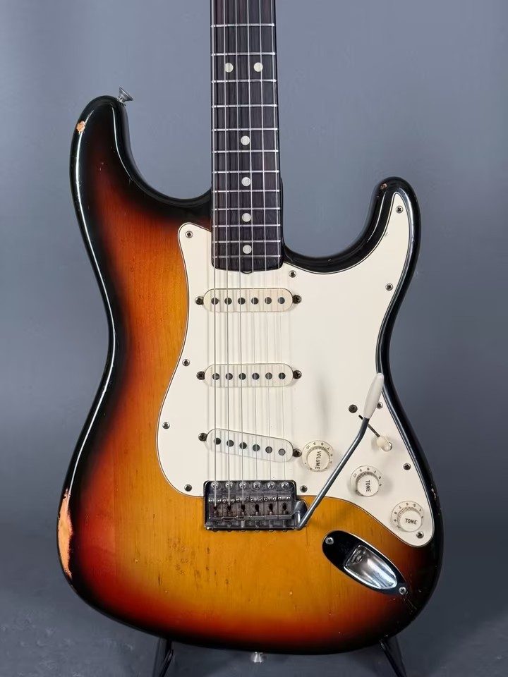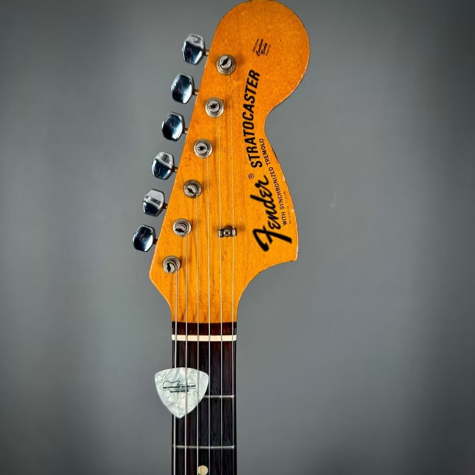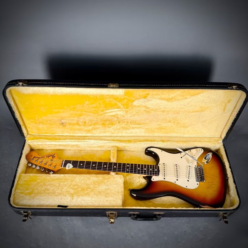 Hier eine absolut originale Fender Stratocaster mit nur 3,190kg, 4 Punkt aus Erstbesitz, inklusive des alten Koffers (kein Fender)…