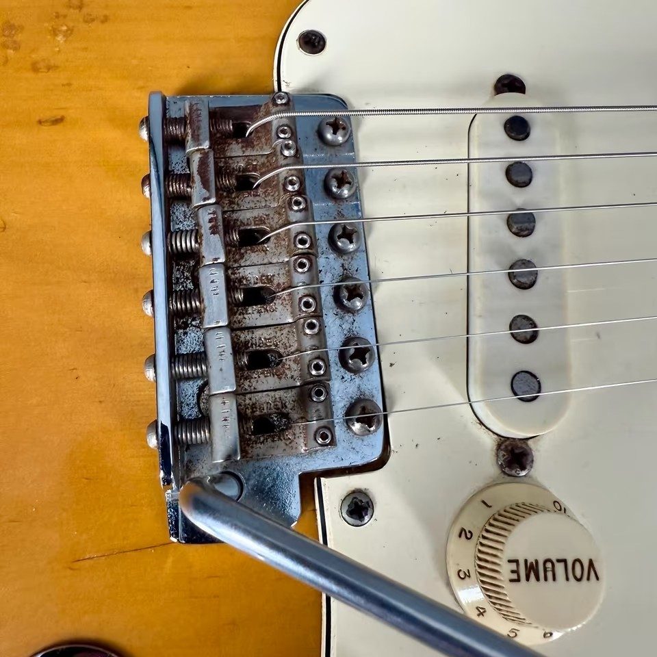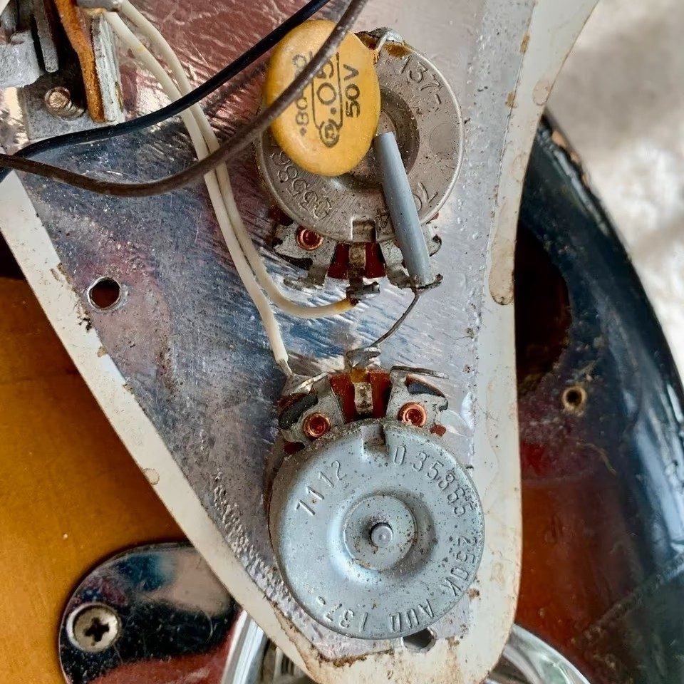 Tonabnehmer, Potis, Tremolo, Mechaniken, 3-Wege Schalter und Gurtpins sind hier offensichtlich original, siehe Fotos!
