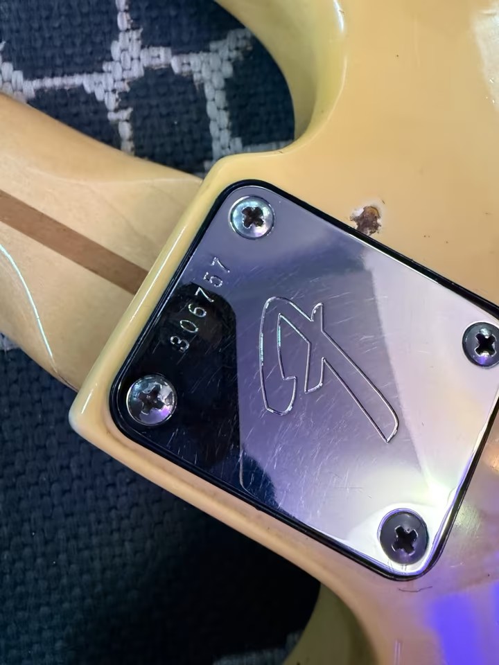 Hier sind noch die originalen Tonabnehmer verbaut, gestempelt 1972. Die Potis und das Schlagbrett wurden mal ersetzt!