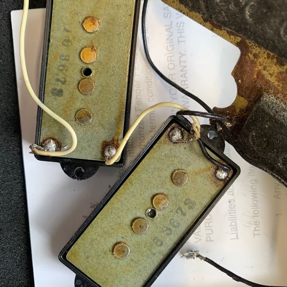 Hier sind zzt. ´63 Fender American Vintage Tonabnehmer verbaut, die originalen PUs – gestempelt 1973 – sind anbei!