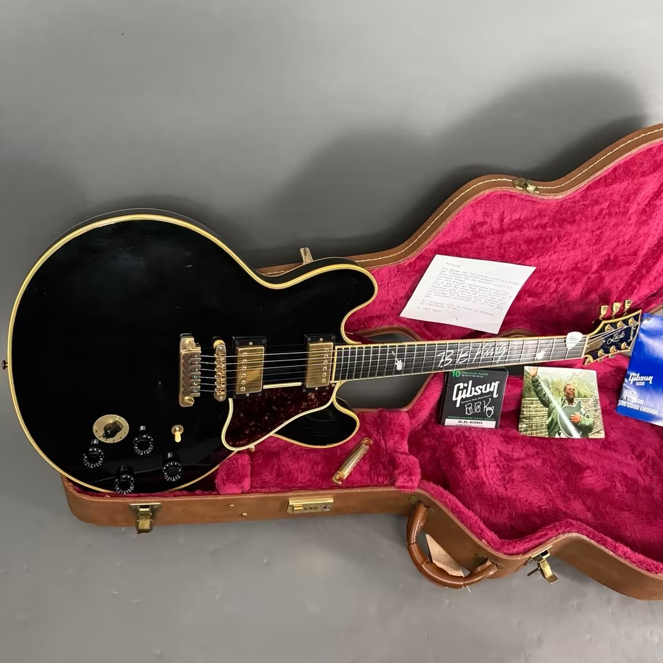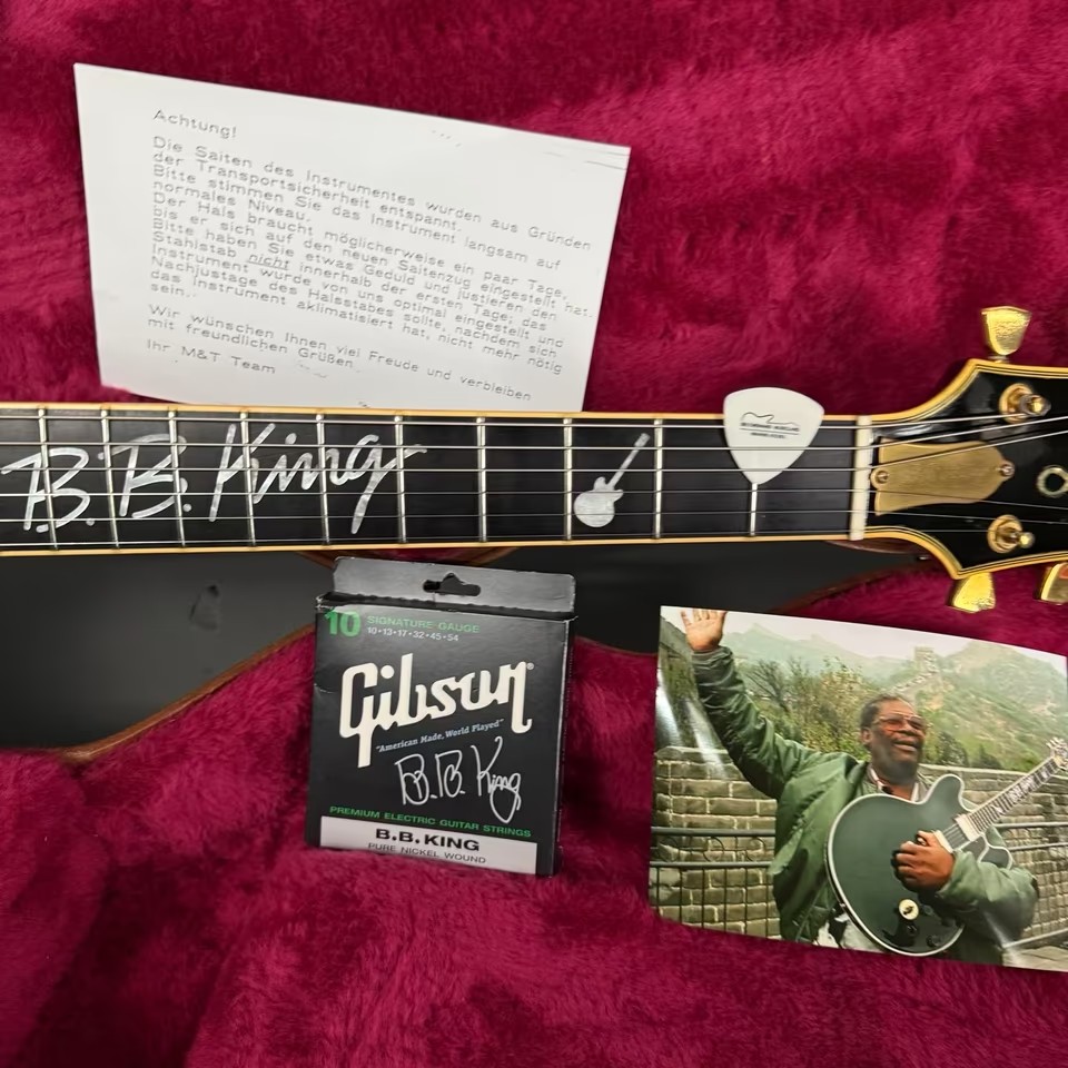 Here is a Gibson BB King Lucille – the version for his 70th birthday. Limited edition that Gibson released for his birthday, with a special inlay on the fingerboard. The guitar is completely original with a great patina! The paint has set beautifully here, you can see lots of small cracks along the grain! The hardware also has a nice but not too extreme patina! The white binding here has aged beautifully to a cream color. There are no notches or grooves in the frets or even in the fingerboard! A great guitar for players, collectors and investors! Weight: 4,280kg We completely overhauled and polished the guitar! We were treated to a fresh set-up with a new set of GHS Boomers size 11-50. Among other things, the frets were polished, the fingerboard was cleaned and oiled, the string position and intonation were optimally adjusted… The guitar comes in its original Gibson brown case/ suitcase, including „transport service instructions“ from the then distributor M&T (Germany) and the Blue Warranty of Gibson..