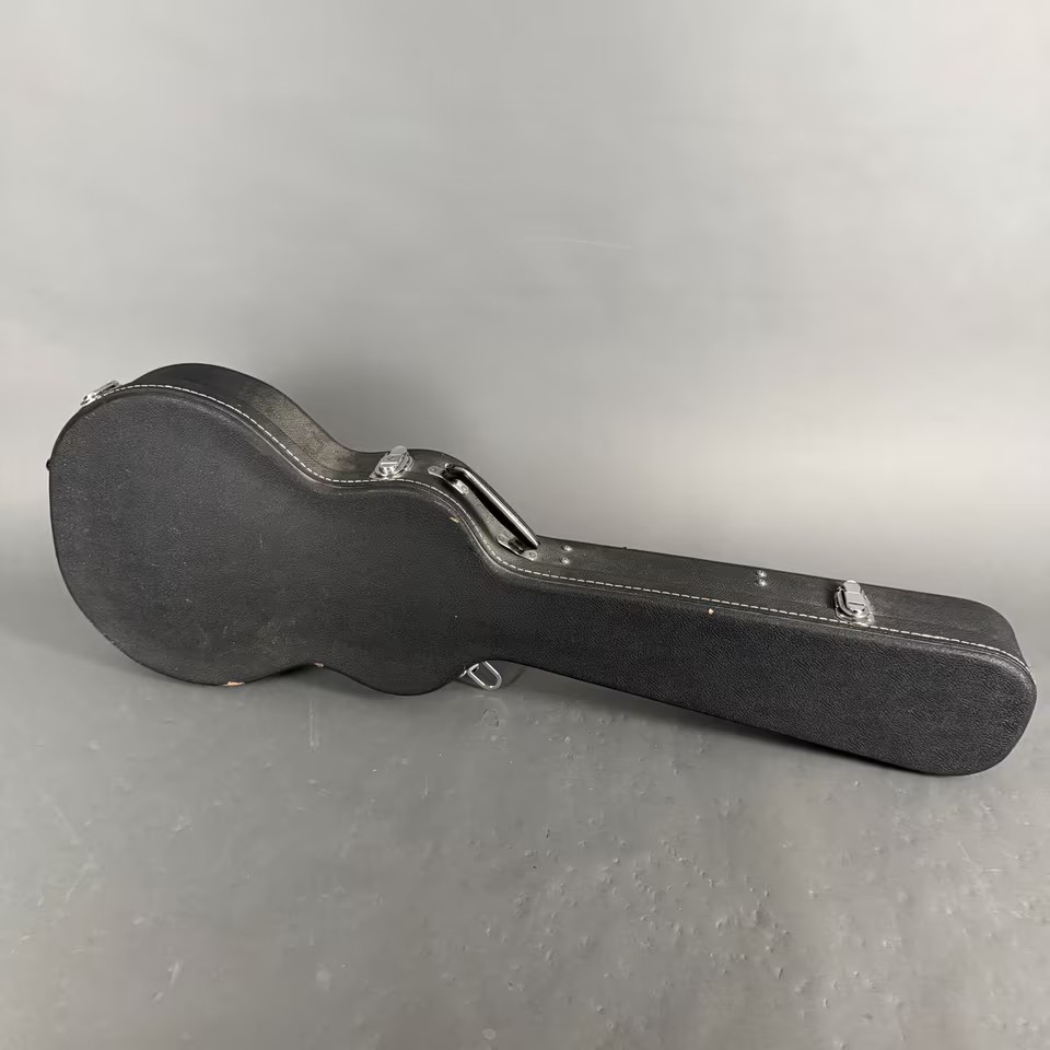 Die Gitarre kommt in einem LP-Formkoffer aus den 1990er Jahren,