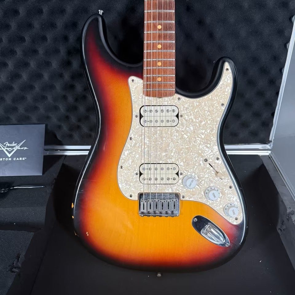 Hier eine Fender Sub – sonic Stratocaster auf dem Fender Custom Shop aus dem Jahre 2001, in sunburst mit 2 Humbucker Tonabnehmer und nur 3,450 kg, eine tolle PLAYER im Flightcase..