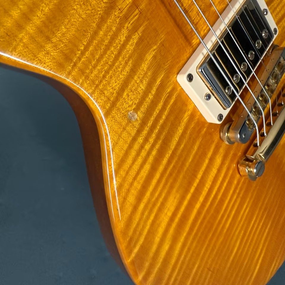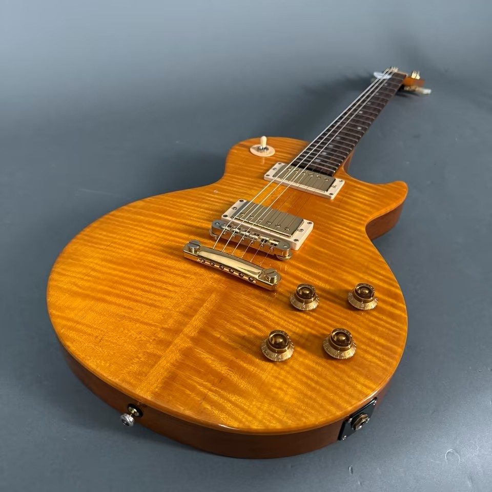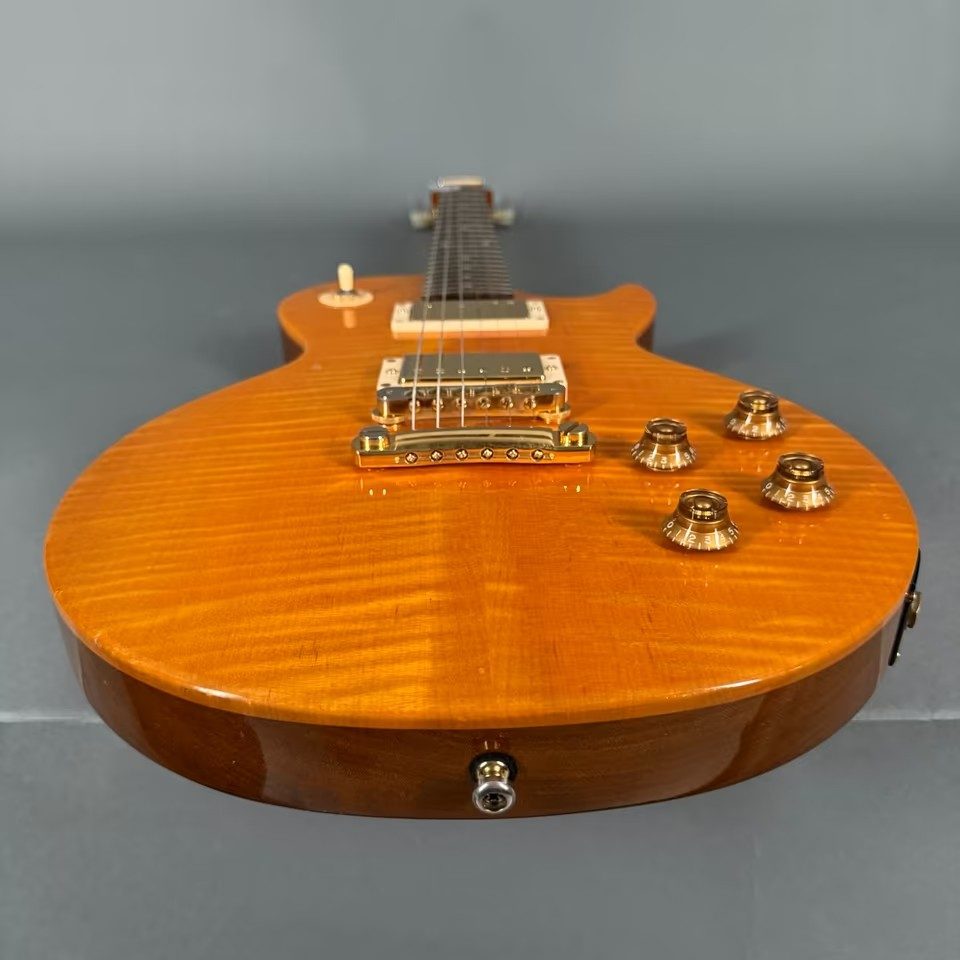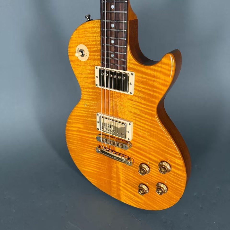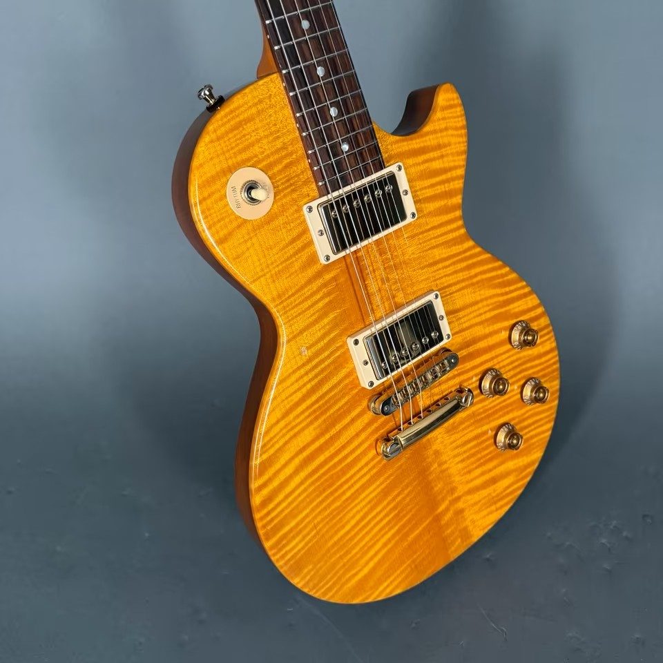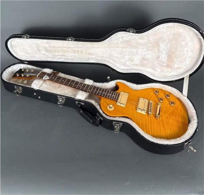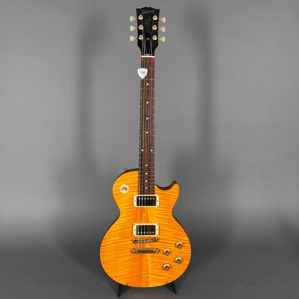 Dieses Modell hat einen schlankeren Mahagonikorpus und eine wunderschön gemaserte Maple Decke und ist mit goldfarbener Hardware und 2 Gibson Humbuckern (490T/490R) ausgestattet..