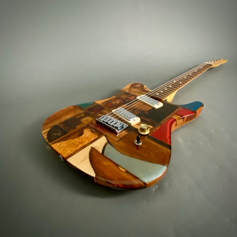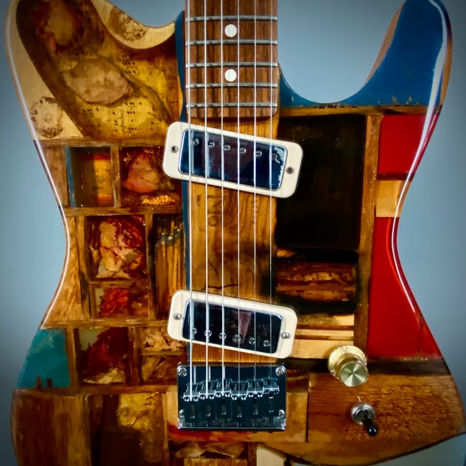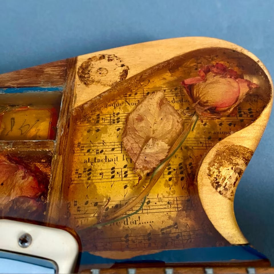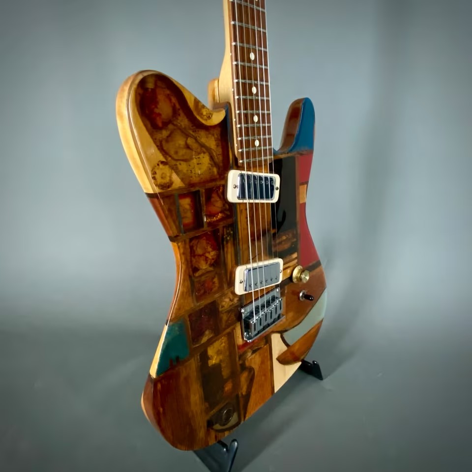 Bei der Totem „Guns & Roses“ sind zwei Gibson Minihumbucker aus den späten 60er Jahren oder frühen 70ern verbaut, welche Michael Spalt um ihres klaren Tons sehr schätzt. Die Gun hat einen Birkenholz-Korpus, einen Arhon Hals mit Makassar Ebenholz Griffbrett und einer Fender-typischen Mensur. Diese Gitarre hat ein ziemlich auffallendes Top aus Kunstharz mit vielen Einschlüssen z.B. eine Patronenhülse, einem Revolver und eben einer Rose usw..
