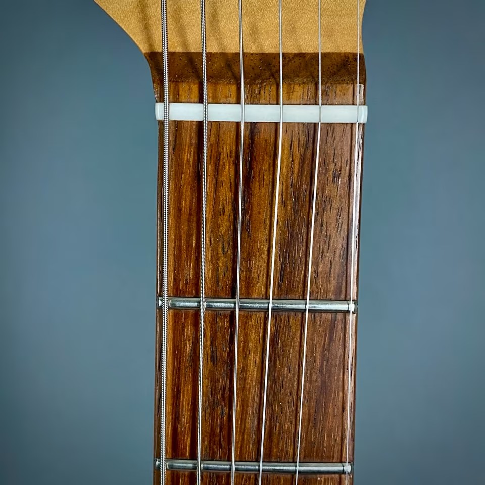 Wir haben der Gitarre ein Setup mit neuen E. Ball Saiten der Stärke 10-46 gegönnt, hierbei wurde das Griffbrett gereinigt und geölt, die Intonation und Saitenlage optimal eingestellt!