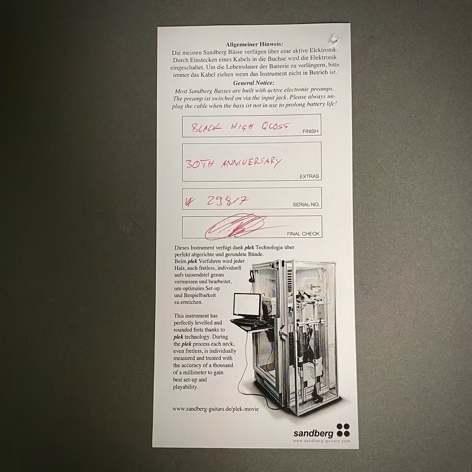 Anlässlich des runden Geburtstages hat man dieses Sondermodell auf der Musik Messe 2016 vorgestellt. Die 30th Anniversary Modelle mit Erle-Body und schwarzer Hochglanz-Lackierung, sechsfach verschraubter Ahornhals mit matching headstock, Palisandergriffbrett mit 30th-Anniversary-Inlay und 22 Frets, Sandberg-Hardware und -Humbucker Tonabnehmern, welcher auf 15 Exemplare limitierte Traumbässe, die mit einem sehr knalligen und druckvollen Ton daherkommen.