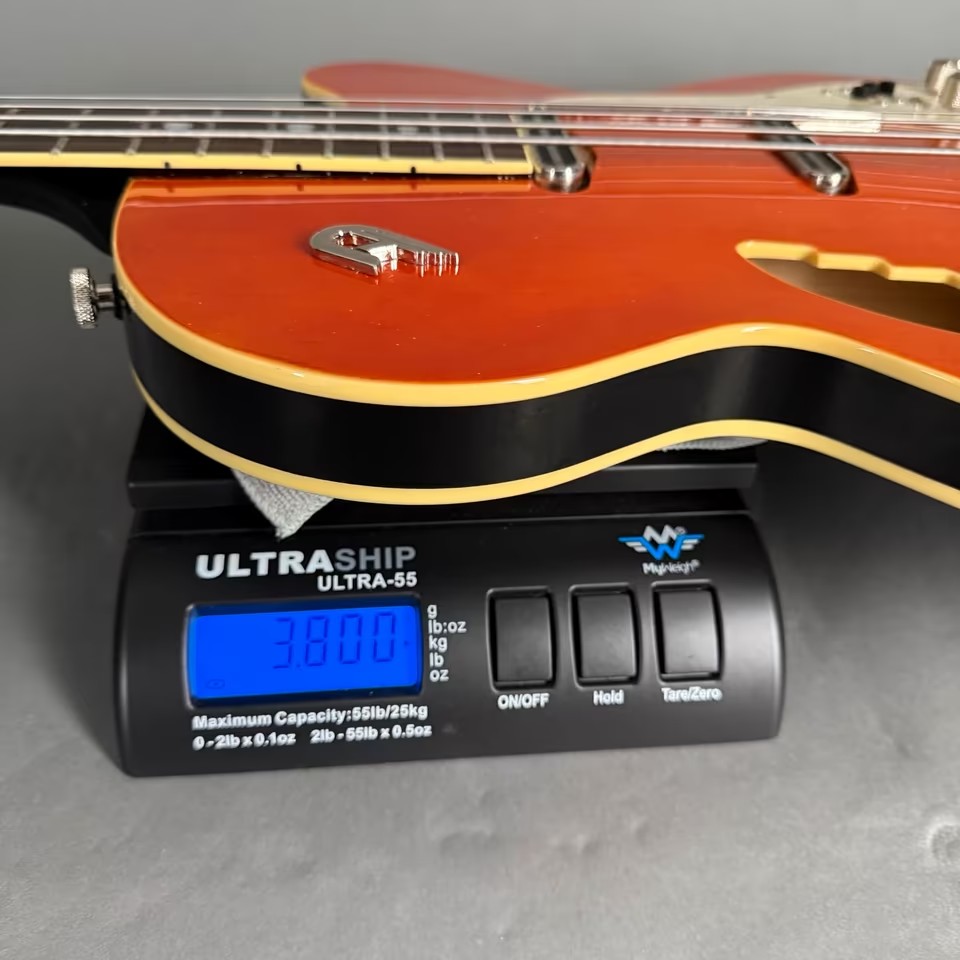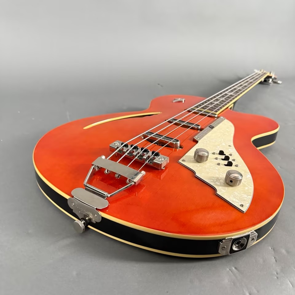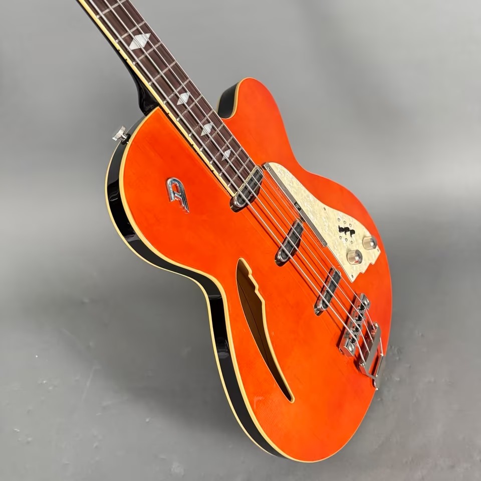 Der Motown-Bass kommt in einem beeindruckenden Vintage Orange daher. Dabei wird eine leicht dunklere Beize vor der orangefarbenen aufgetragen, um alle Nuancen der fein gemaserten Fichtendecke deutlich zur Geltung zu bringen.