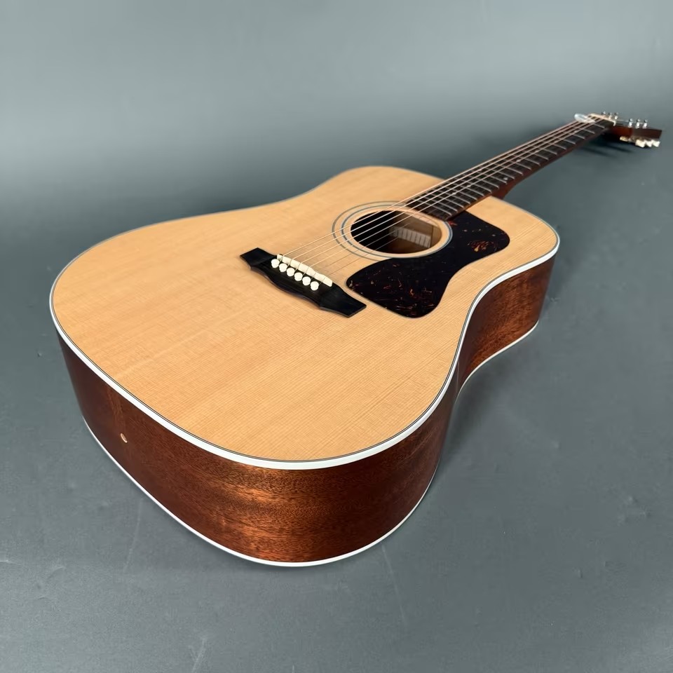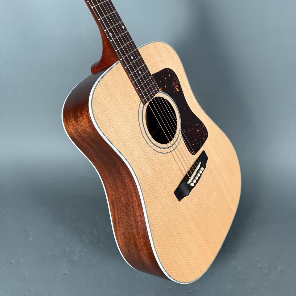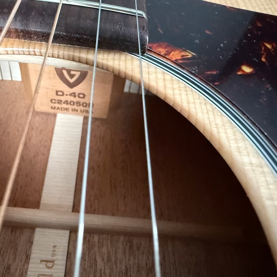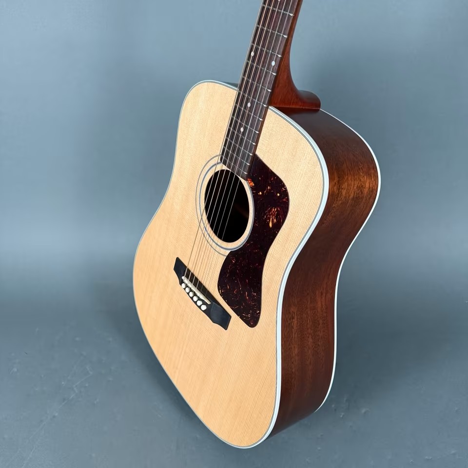 Die D-40 von Guild USA ist perfekt für Spieler, die den ultimativen Dreadnought-Sound suchen. Die klassische Holzkombination aus einer massiven Sitka-Fichtendecke und einem massiven afrikanischen Mahagoni-Boden und -Zargen sorgt für bemerkenswertes Volumen, Klarheit und Sustain. Die D-40 verfügt über einen Steg und ein Griffbrett aus ostindischem Palisander, hochwertige 20:1-Mechaniken mit offenem Getriebe sowie einen handgeschnittenen Knochensattel und -sattel. Eine elegante und dünne Satin-Lackierung verleiht dieser Gitarre ihr vertrautes „broken-in“-Look und -Gefühl, während die Tonhölzer ihr optimales Klangpotenzial entfalten können. Zu den zeitlosen Ausstattungsmerkmalen der D-40 gehören eine Rosette im Vintage-Stil, ein Schildpatt-Schlagbrett, weißes ABS-Binding und das Guild Peak-Logo auf der Kopfplatte als Intarsie. Jede D-40 wird mit einem handsignierten, nummerierten Echtheitszertifikat und einem Guild Archtop-Holzkoffer mit integriertem Humicase®-Befeuchtungssystem ausgeliefert. Zu den Oberflächenoptionen gehören Satin-Lackierung in Natural oder Antique Burst mit Cabernet-Boden, -Zargen und -Hals.