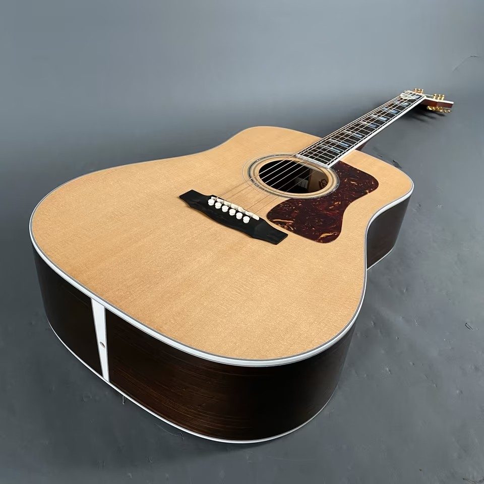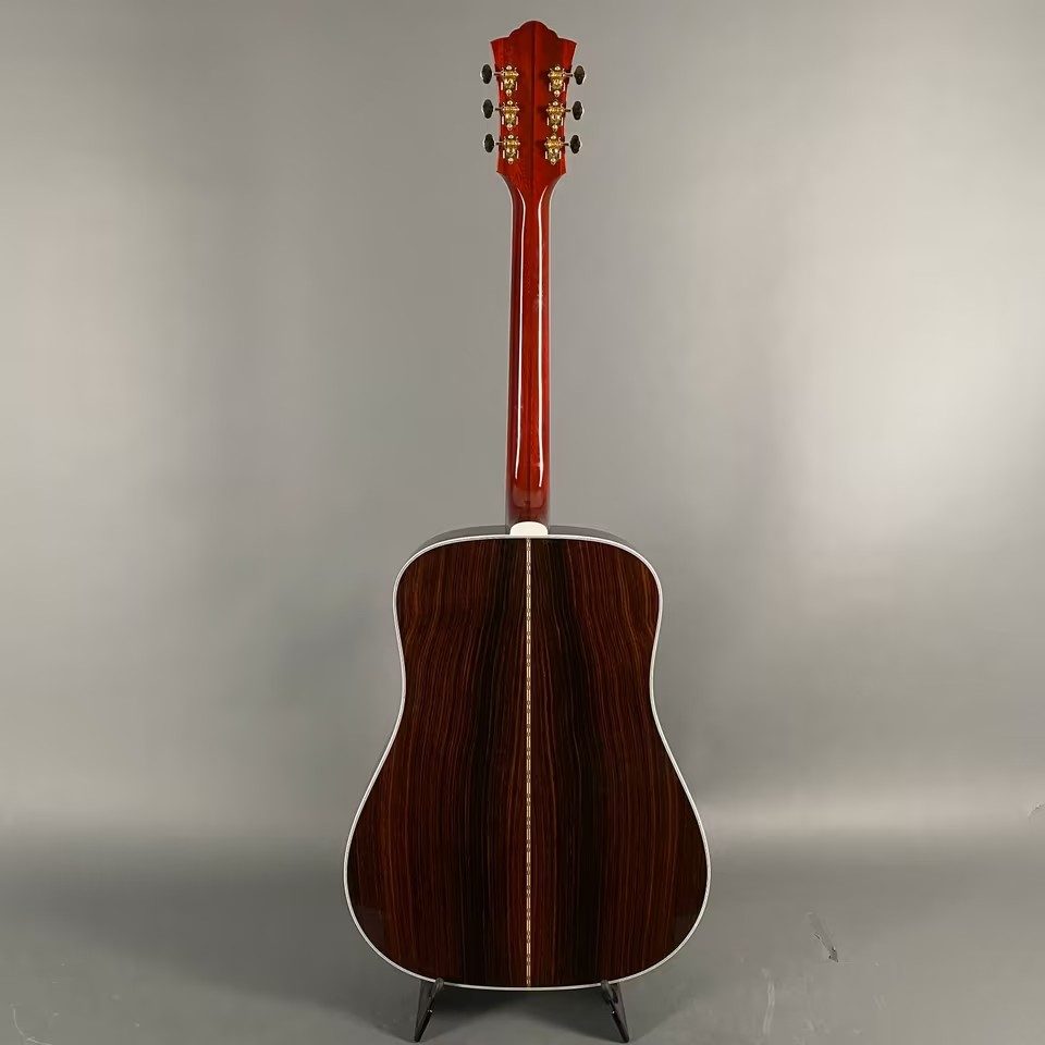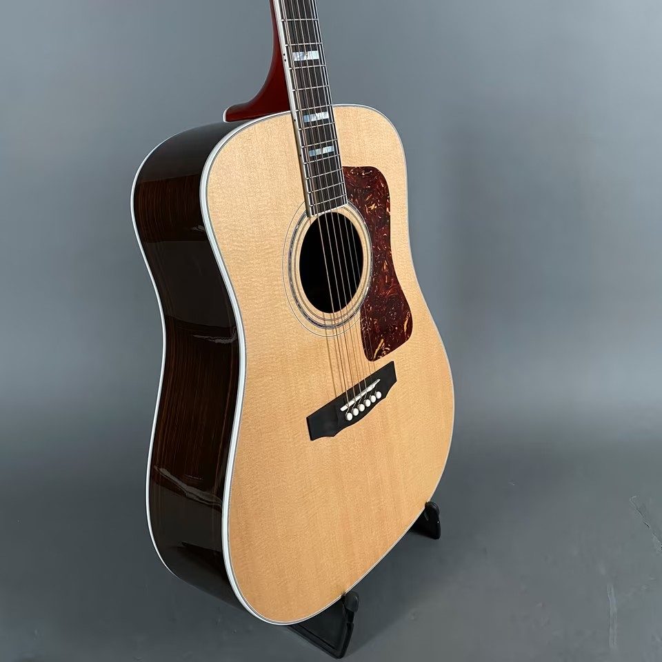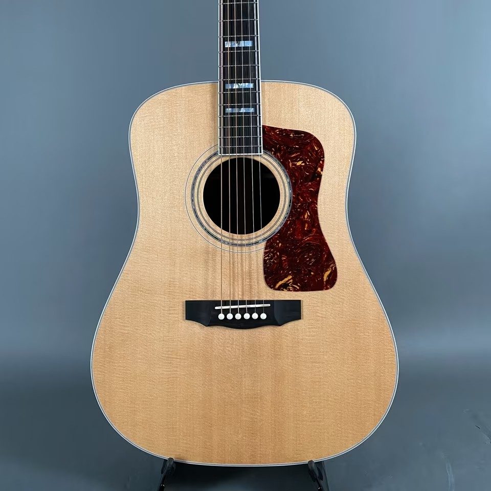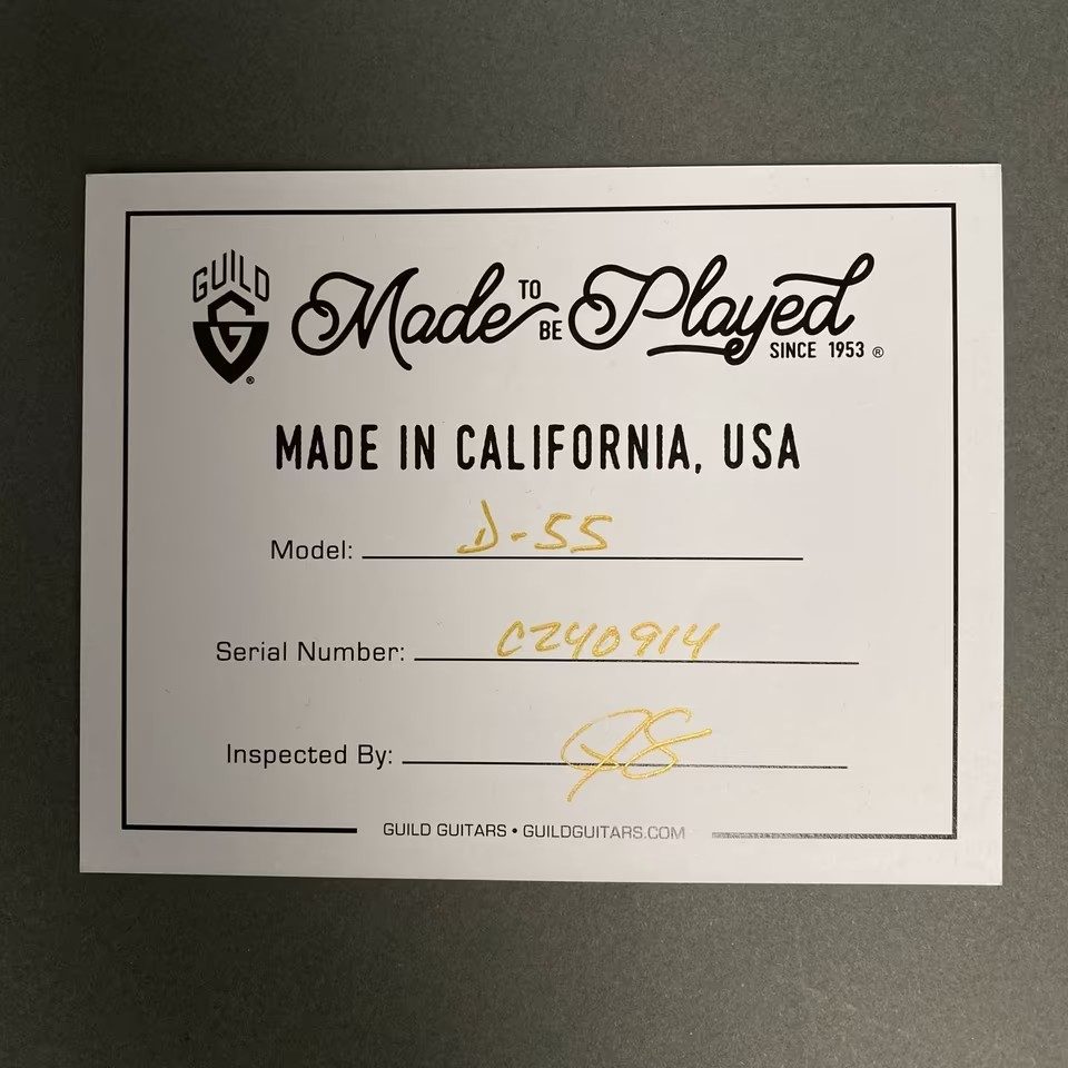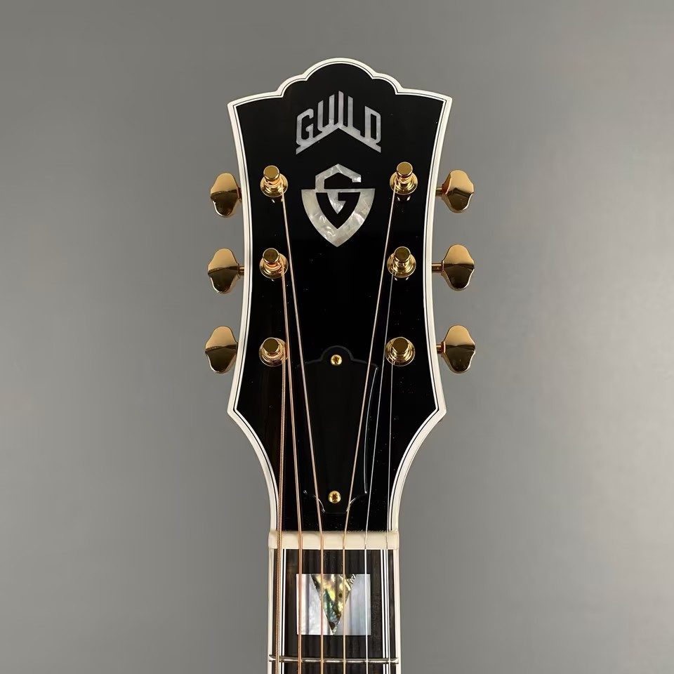 D-55 verfügt über die bekannteste Kopfplatte von Guild, vollständig eingefasst und Guild „Peak and Shield“-Einlage über einem gemaserten Ebenholz-Overlay aufweist. Das Ebenholz-Griffbrett ist ebenfalls vollständig eingefasst und mit V-Blocks“ aus Abalone und Perlmutt sowie einer mehrzeiligen Railroad Track“-Einlage auf der Bass- und Diskantseite versehen.