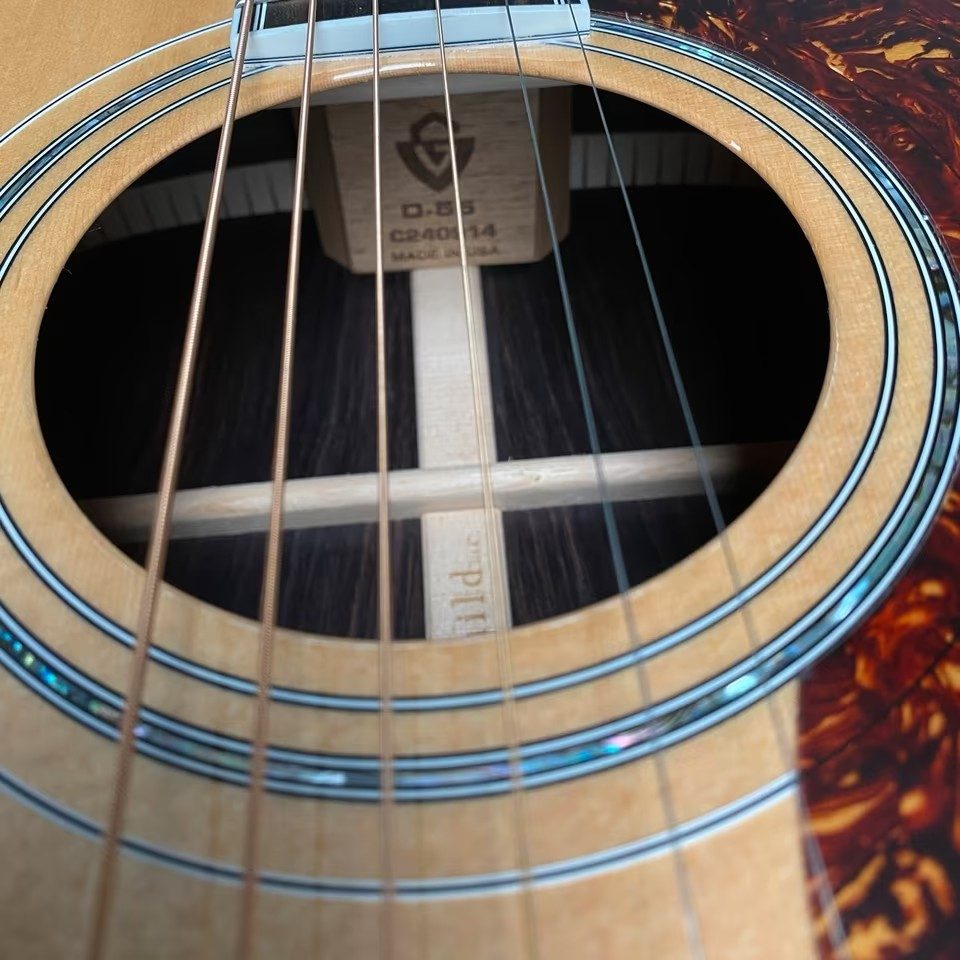 Die D-55 bleibt der hochwertigen Ausstattung ihres Vorgängers aus dem Jahr 1968 treu, einschließlich einer Decke aus AAA-Sitka-Fichte, Boden und Zargen aus massivem indischem Palisander, Griffbrett und Steg aus Ebenholz und Nitrocellulose-Lackierung. Zu den inneren Verfeinerungen gehören die überhöhte Adirondack-Verstrebung sowie ein verbessertes Schwalbenschwanz-Halsgelenk, das von Hand eingepasst wurde, um diese Generation der D-55 zur bisher leichtesten, lautesten und bestklingenden zu machen.