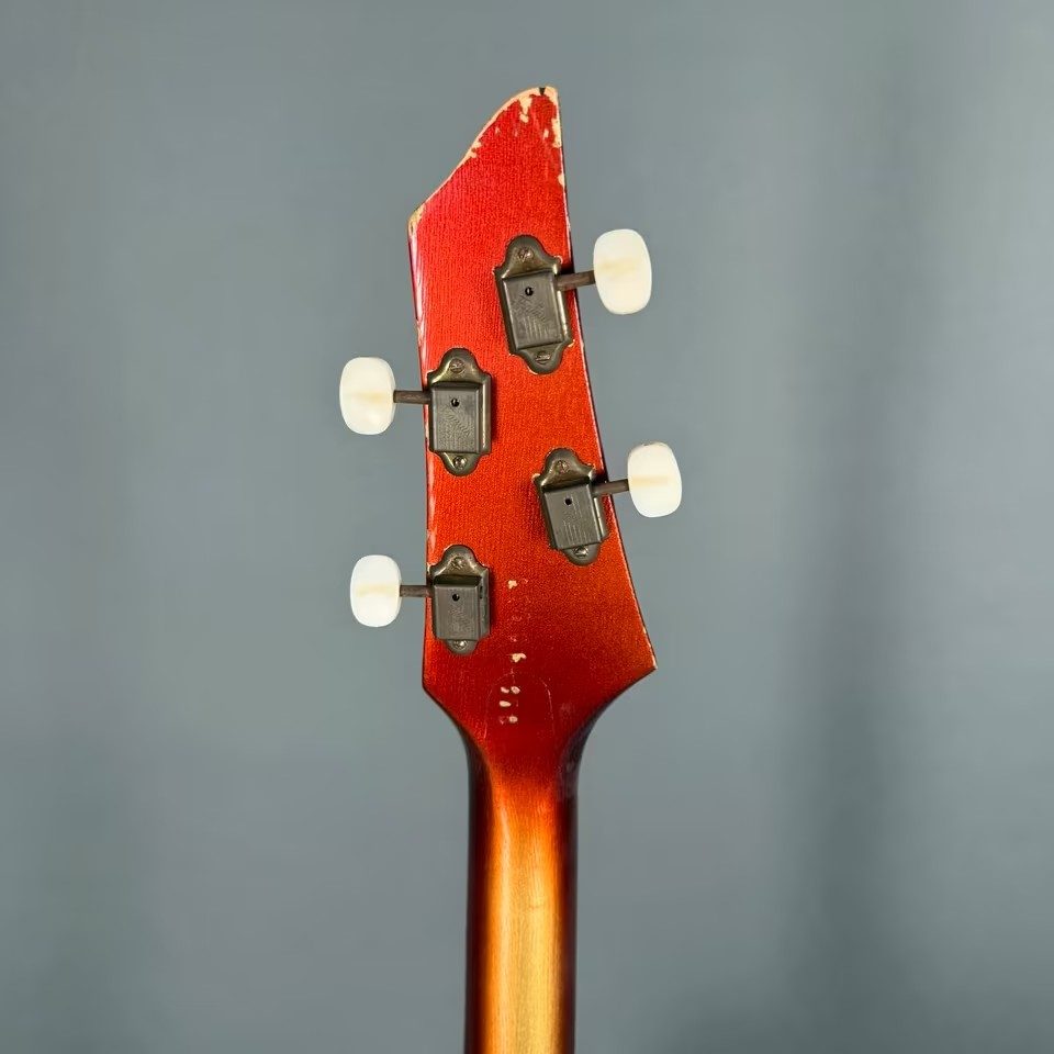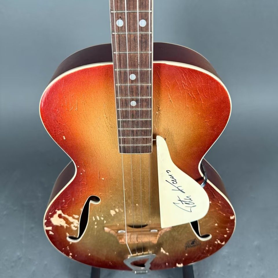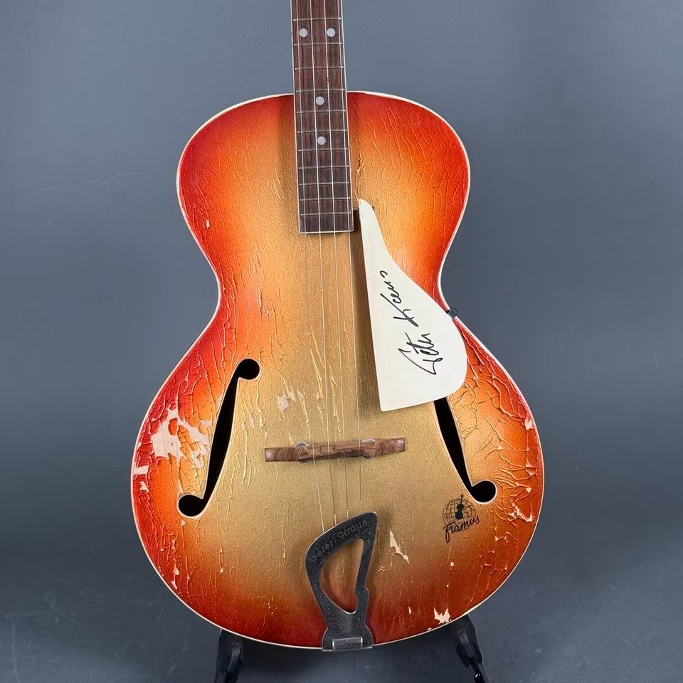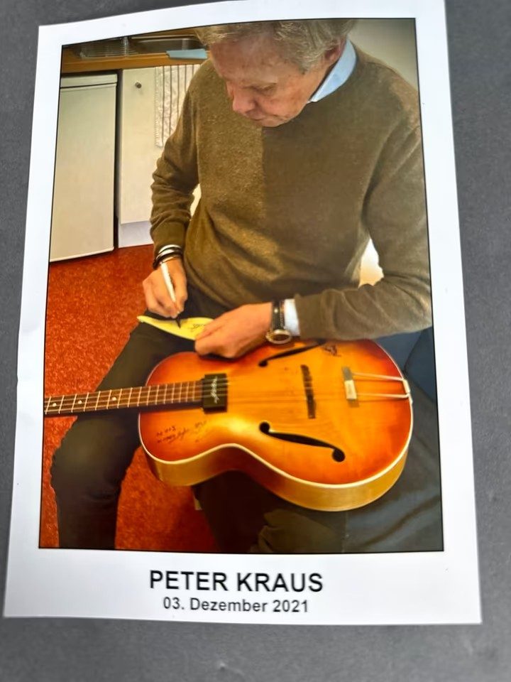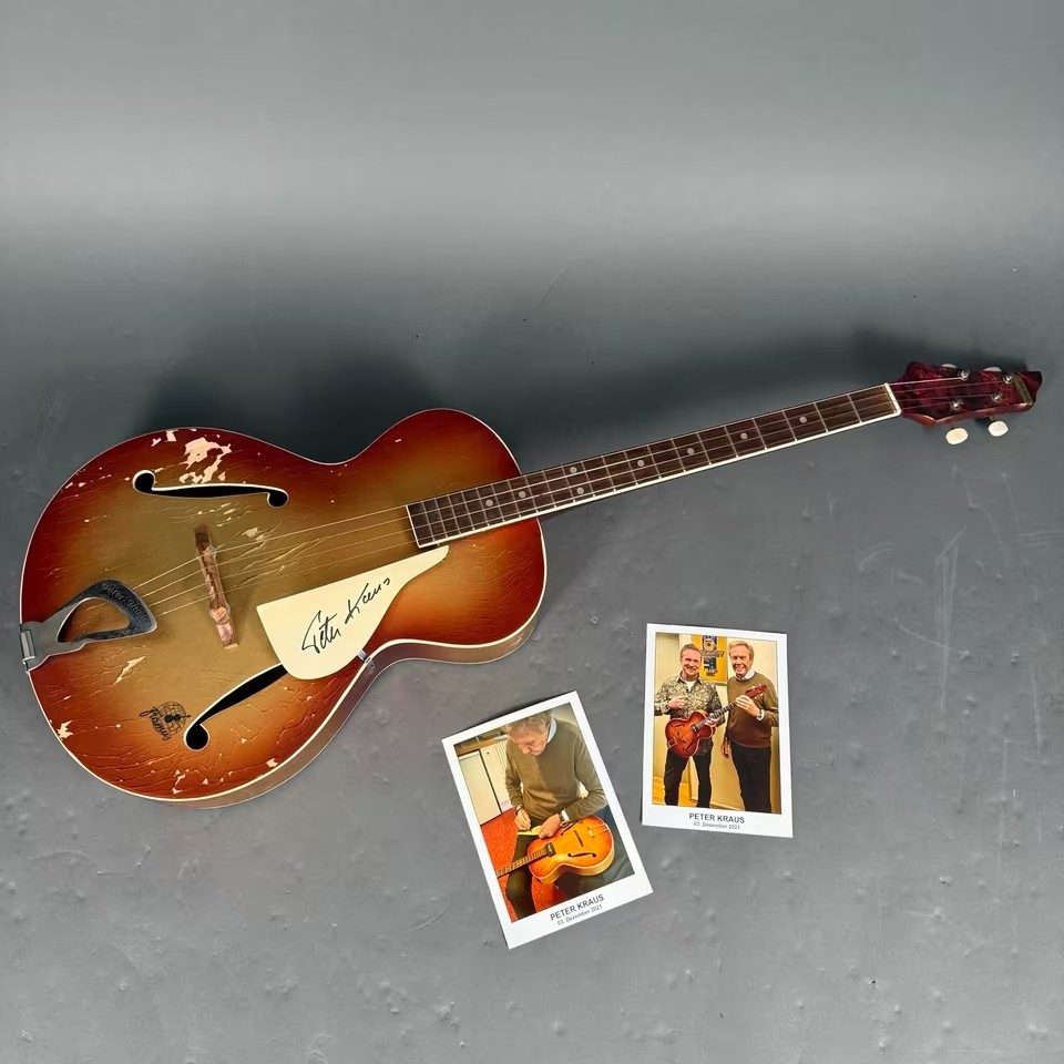 Hier eine original Framus 4 Saiter, Modell Peter Kraus mit original Autogramm …. hierbei handelt es sich um die aufwändig gefertigte Version in einer damals modernen Farbkombination rot/orange gold metallic lackiertes Modell Nr. 5/140 Peter Kraus Solist!