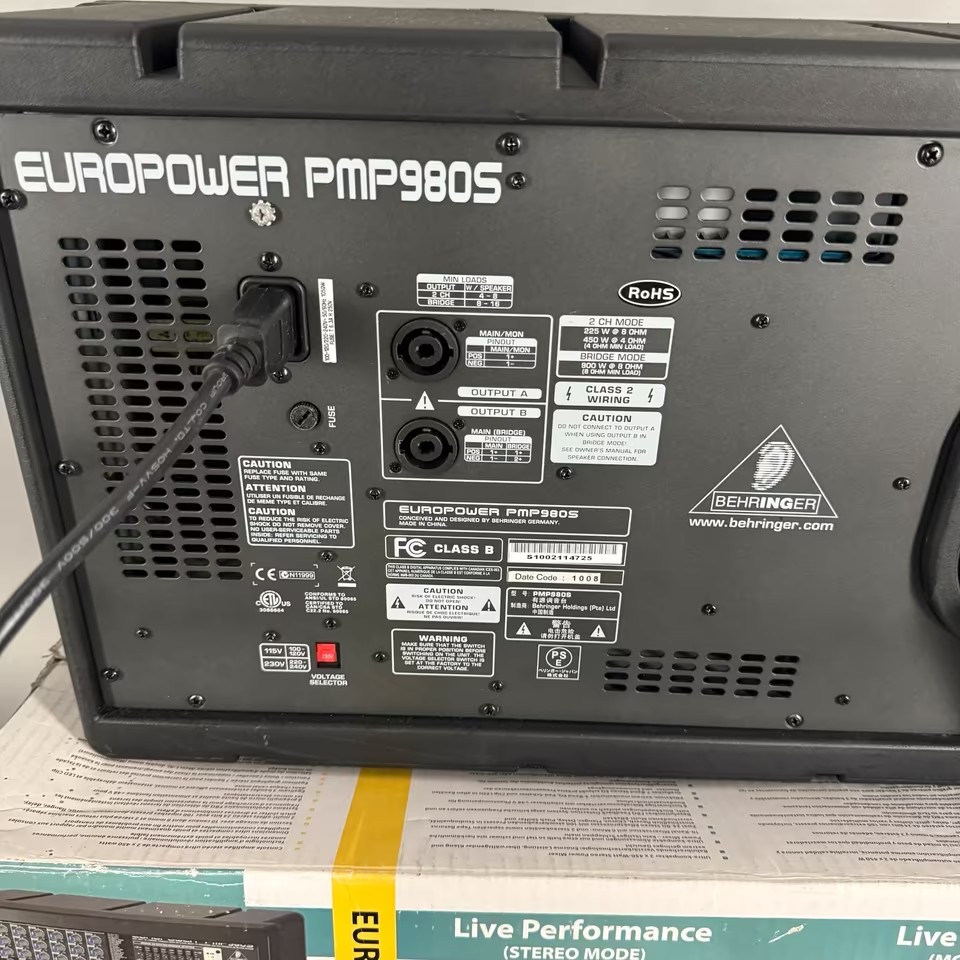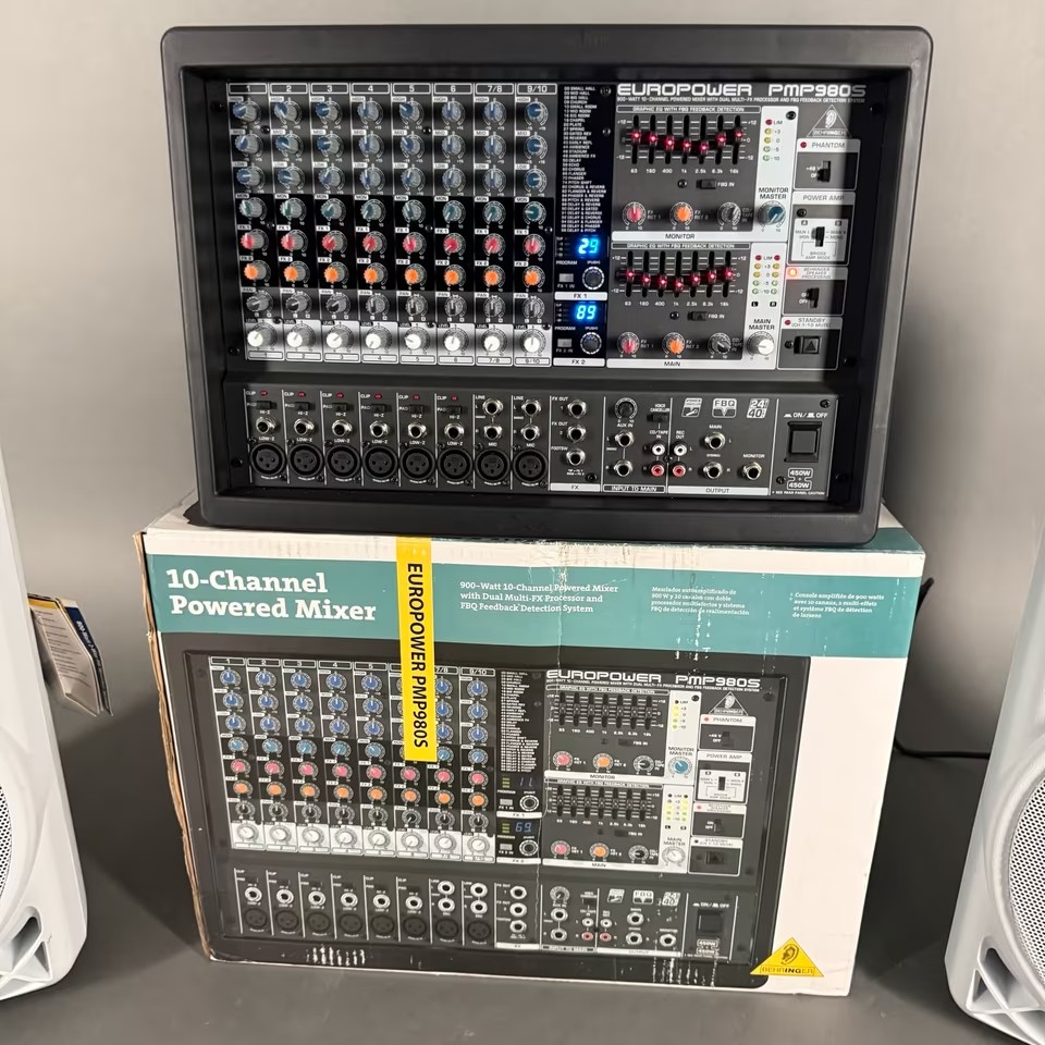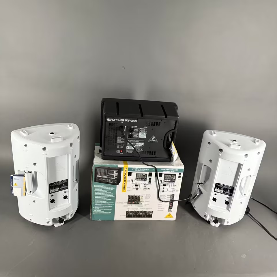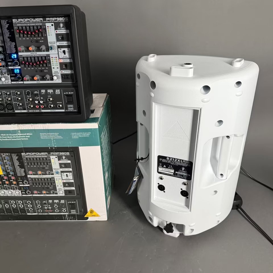 Behringer PA Europower PMP 980S Powermischpult im original Karton + 2 x B212XL Lautsprecherboxen in WEIß und 2 x Speakon Speakon Lautsprecherkabel..