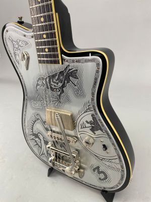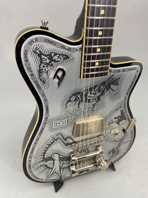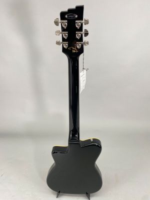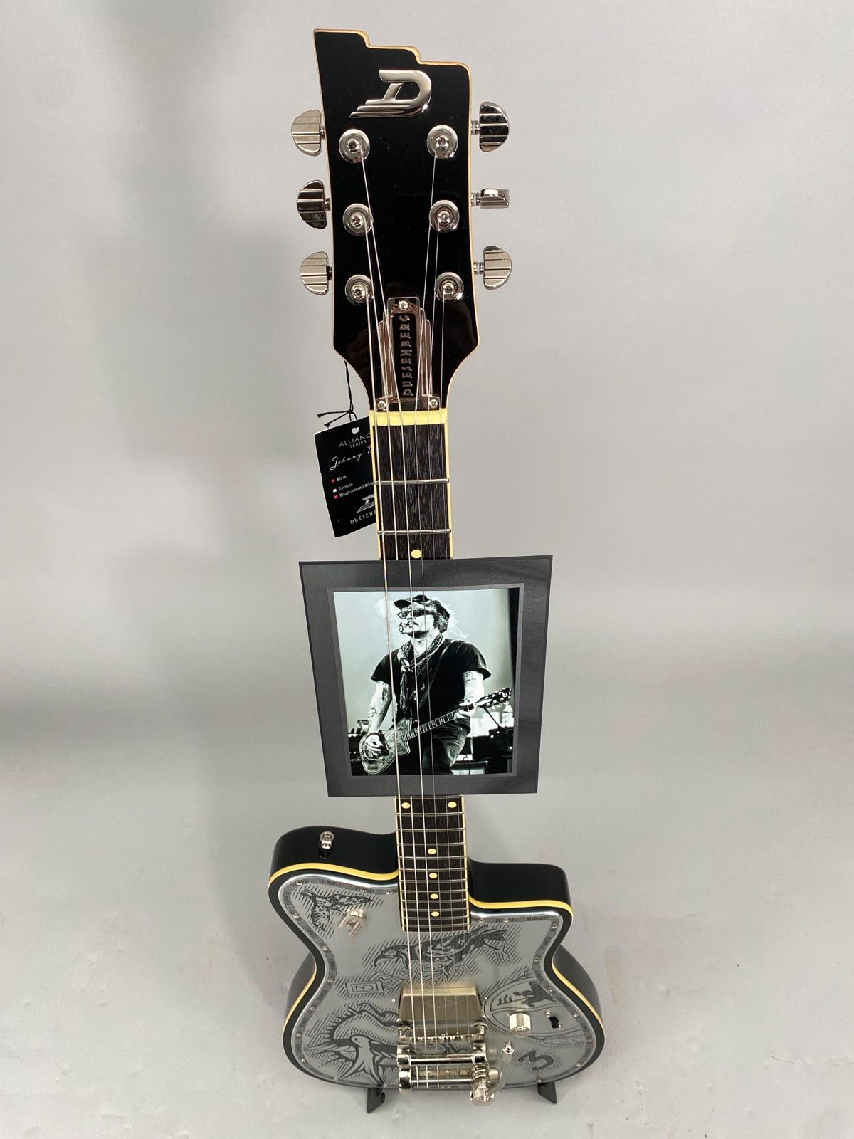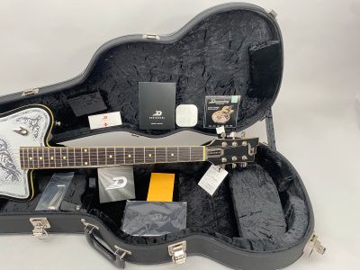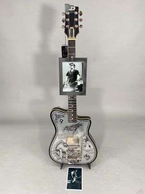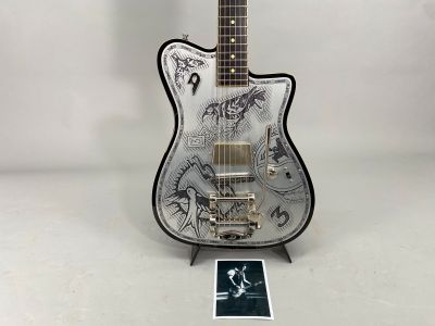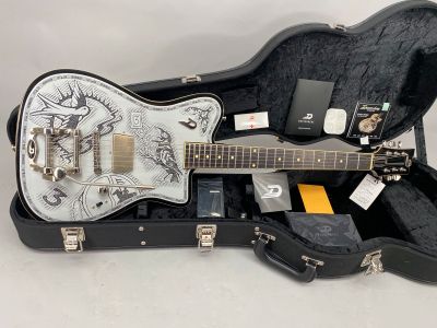 Johnny Depp gehört zur Garde der angesagten Hollywood Schauspieler, die aber auch respektable Musiker sind. Als Mitglied der Hollywood Vampires und nun gemeinsam mit Jeff Beck, bedient er die Gitarre an der Seite von Alice Cooper, Joe Perry sowie diversen Gaststars. Duesenberg hat in Zusammenarbeit mit Johnny Depp eine coole Signature Gitarre kreiert. Die Duesenberg Alliance Johnny Depp ist sowohl optisch als auch von der Ausstattung ein echtes Highlight. Die Decke des mit Tonechambers versehenen Erlenbodys trägt ein graviertes Alu Pickup im Zemaitis Stil mit Johnny Depp Tattoo Artwork. Auch die Elektrik ist ungewöhnlich: ein kräftiger Duesenberg JD-63 tapped Single Coil sorgt für oderntlich Druck, bei Bedarf kann die Spulenanzapfung geschaltet werden, was einen cleanen Single Coil Sound ergibt. Mit an Bord ist das kutlige Tremolo Tremolo in Verbindung mit der Duesenberg Steel Saddle Bridge.