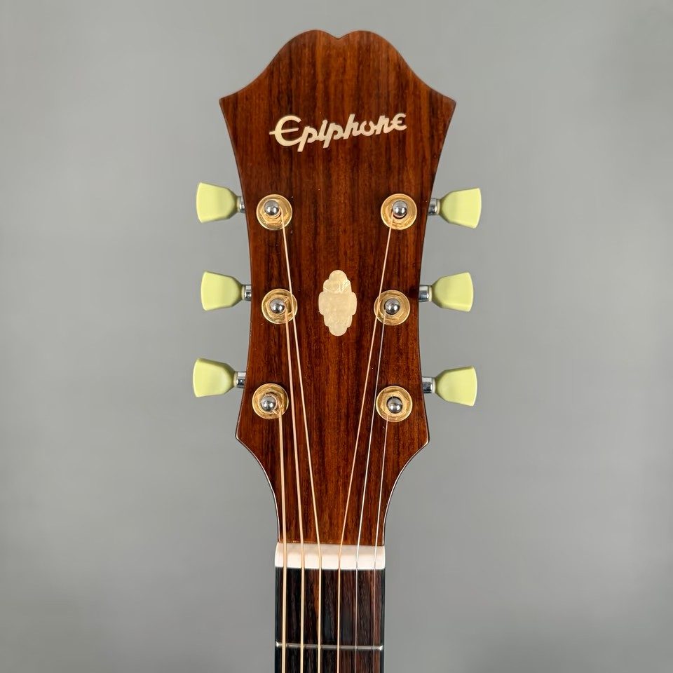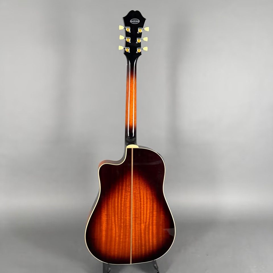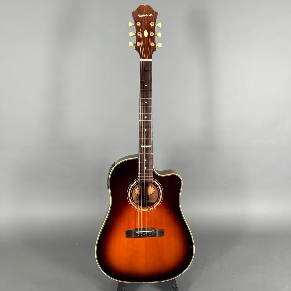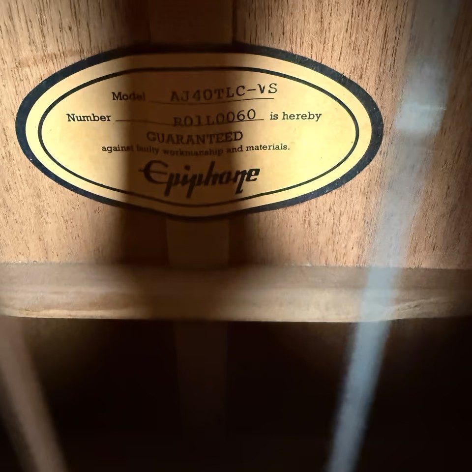 EPIPHONE AJ-40 TLC (MODELL EE4C) hat einen einzelnen abgerundeten Cutaway-Korpus, kein Schlagbrett, einen gebundenen Korpus, Punktgriffbretteinlage/Blockeinlage am 12. Bund, goldene Hardware, Piezo-Tonabnehmer, Electar Epiphonic 2000-Vorverstärkersystem (ausgestattet mit Epiphonic-Six-Vorverstärker/EQ ab 2001), erhältlich in den Ausführungen Ebony, Natural oder Vintage Sunburst, Hersteller. 1998-2002.