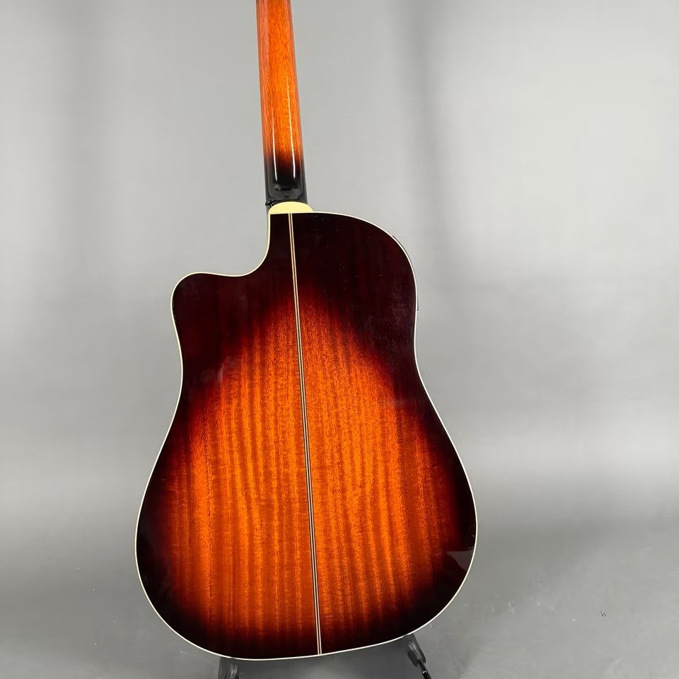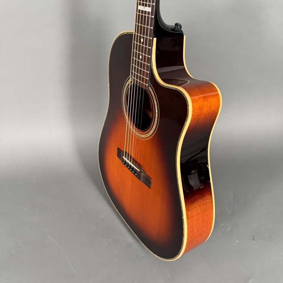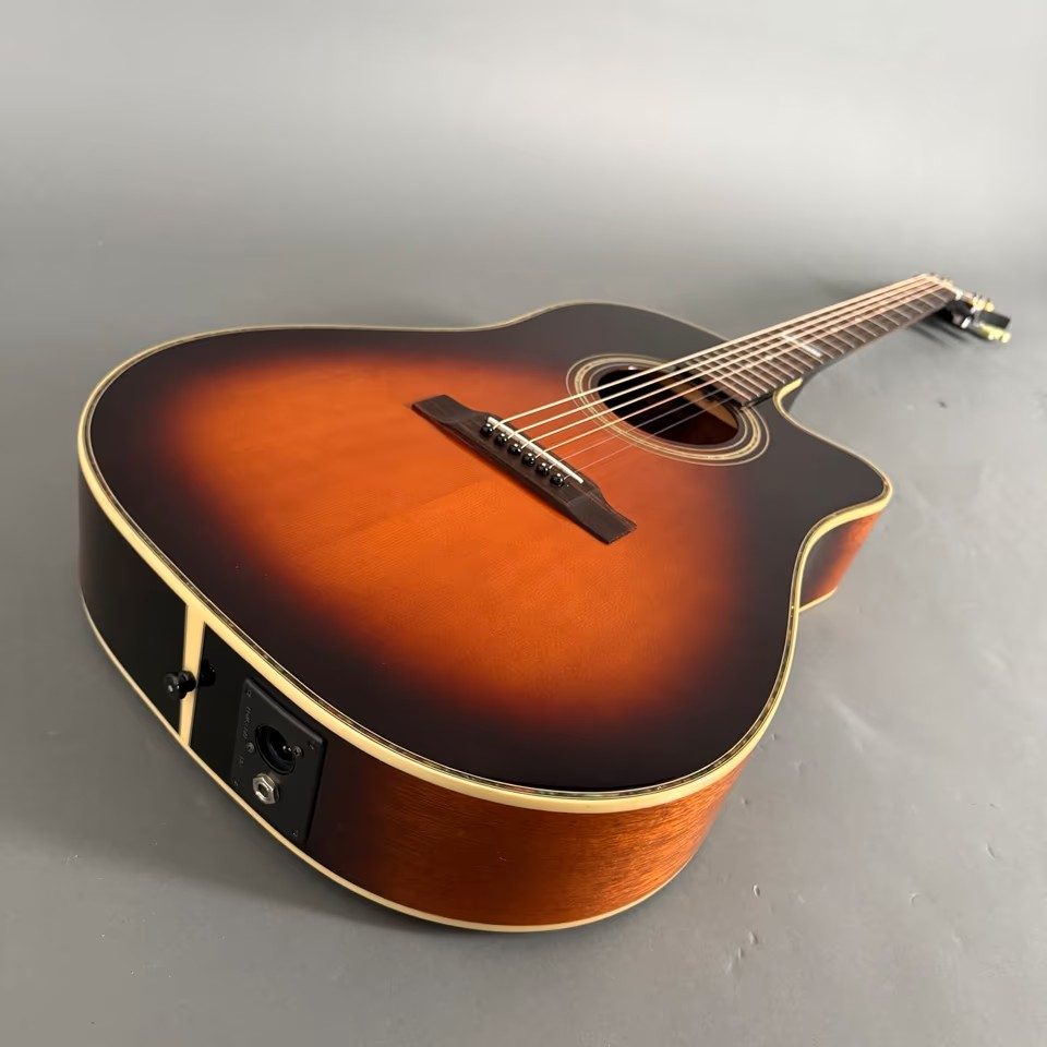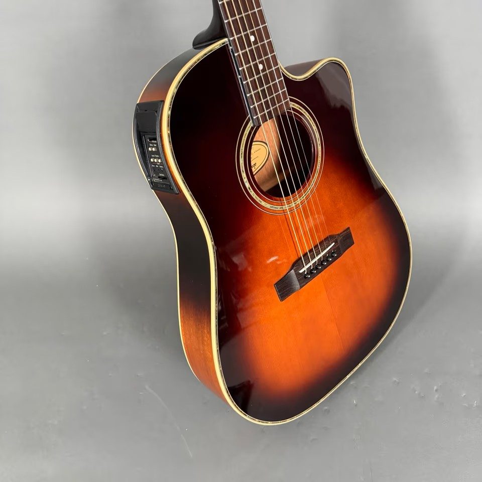 EPIPHONE AJ-40 TLC (MODELL EE4C) hat einen einzelnen abgerundeten Cutaway-Korpus, kein Schlagbrett, einen gebundenen Korpus, Punktgriffbretteinlage/Blockeinlage am 12. Bund, goldene Hardware, Piezo-Tonabnehmer, Electar Epiphonic 2000-Vorverstärkersystem (ausgestattet mit Epiphonic-Six-Vorverstärker/EQ ab 2001), erhältlich in den Ausführungen Ebony, Natural oder Vintage Sunburst, Hersteller. 1998-2002.