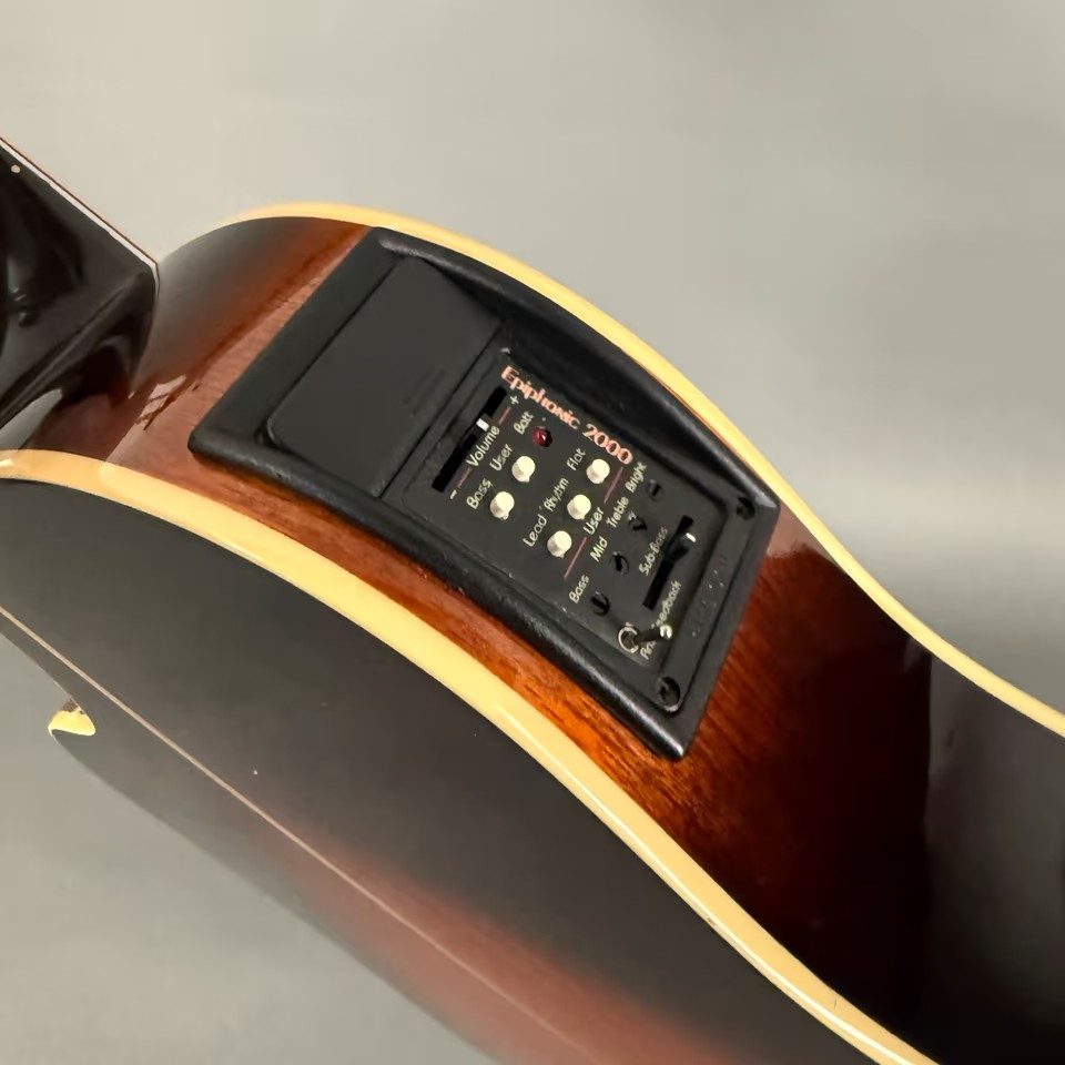 music_note Elektronik: Piezo-Tonabnehmer mit Electar Epiphonic 2000 Vorverstärkersystem (im Jahr 2001 auf Epiphonic-Six Vorverstärker/EQ aufgerüstet)