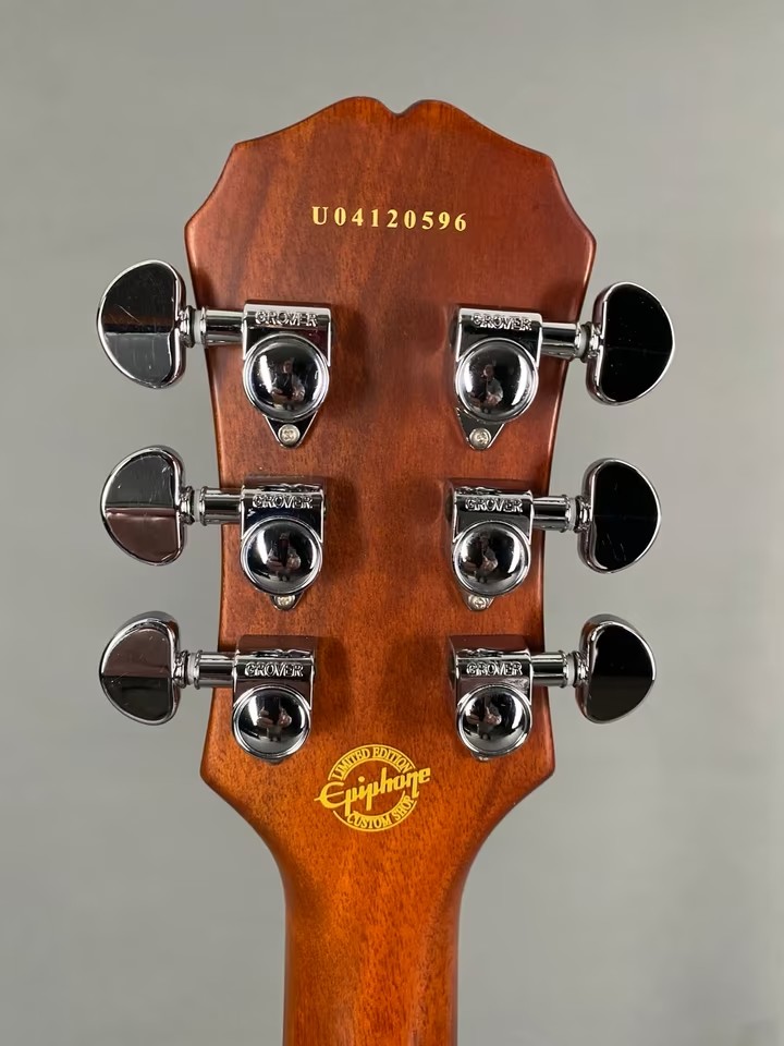 Dieses Modell ist ein echtes Sammlerstück, da sehr gut erhalten, hier mit dem Logo „Limited Edition – Epiphone – Custom Shop“ auf der Rückseite der Kopfplatte.