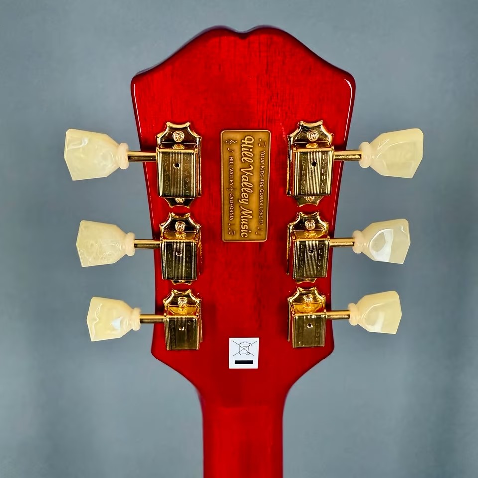 In Anlehnung an den Film sitzt auf der Rückseite der Kopfplatte ein „Hill Valley Music Store“-Aufkleber. Die Back to the Future ES-345 verfügt über goldene Hardware, darunter einen Epiphone LockTone™ Tune-O-Matic™-Steg und ein Bigsby® B70 Tailpiece mit Tremolo. Genau wie bei der Gitarre im Film sind die Schrauben der ursprünglichen Stopbar noch an Ort und Stelle.