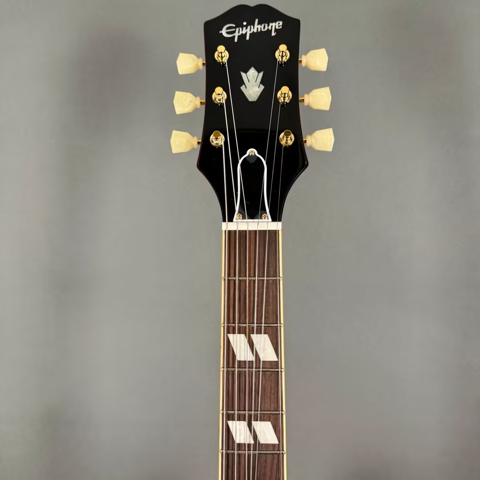 Die Back to the Future ES-345 hat das Modell zum Vorbild, das Michael J. Fox/Marty McFly im Film spielt. Sie ist eine liebevolle Hommage an dieses Kultinstrument und hat einen 5-lagigen Semi-Hollowbody-Korpus aus Ahorn mit massivem Ahorn-Sustainblock. Der Mahagoni-Hals hat ein angenehmes 50s Round-C-Profil und ist mit Palisander-Griffbrett mit einlagigem Binding mit 22 mittelgroßen Jumbo-Bünden versehen und mit Split-Parallelogramm-Inlays in Perloid verziert, ein Markenzeichen der ES-345. Die 60s Kalamazoo-Kopfplatte ist mit einem Graphic Tech®-Sattel und Epiphone Deluxe-Stimmmechaniken mit Keystone-Knöpfen ausgestattet. Das Epiphone-Logo und die Gibson Crown sind in Perlmutt gefasst.