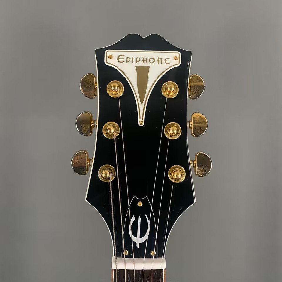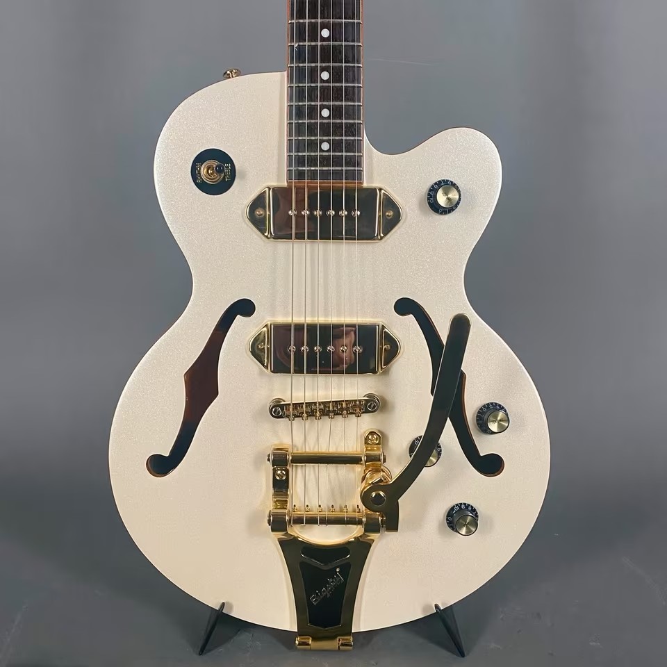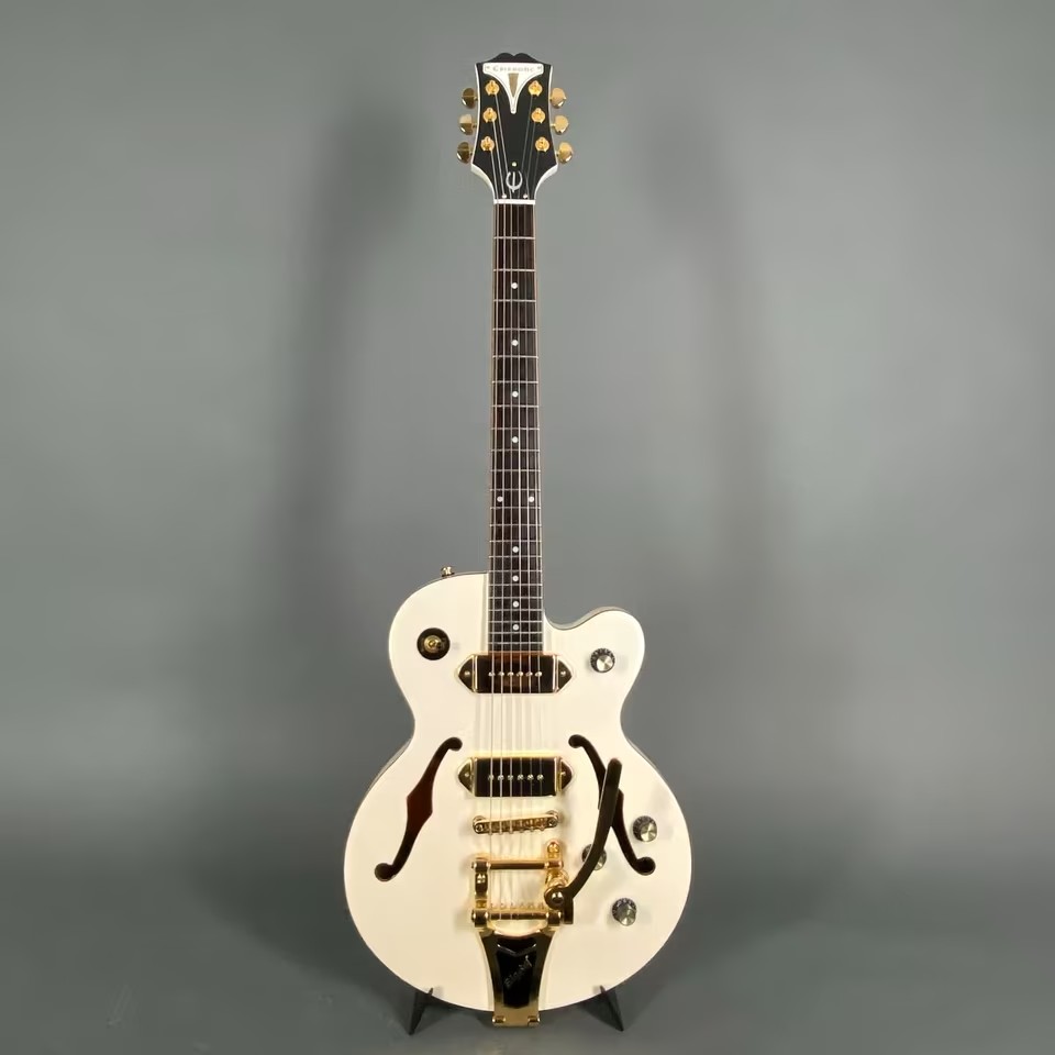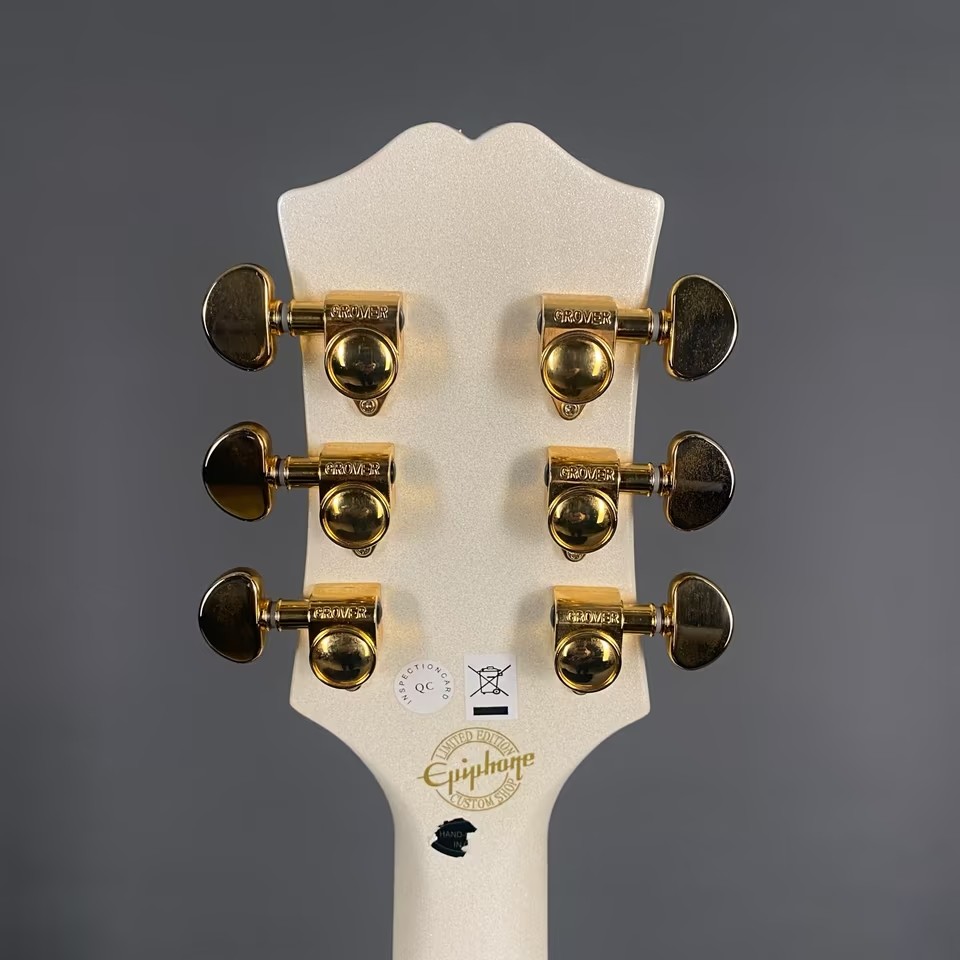 Epiphone Wildkat Royale PW bezieht sich auf ein spezielles Sondermodell aus der „Royale Collection“ in der Farbe Pearl White (PW) mit luxuriöser Gold-Hardware.