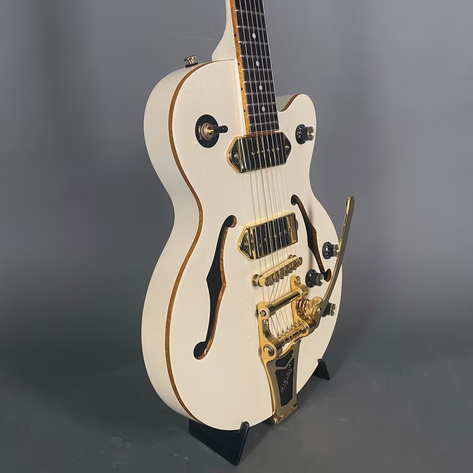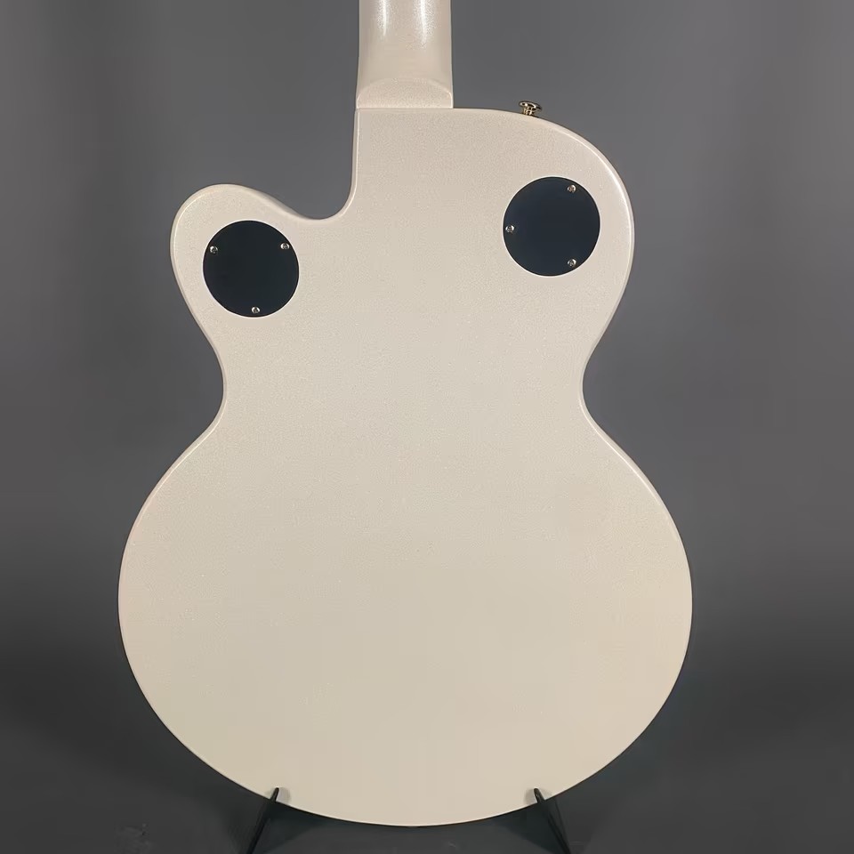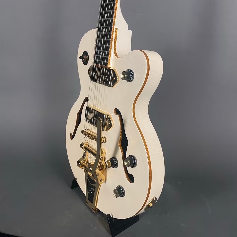 Finish & Design: Glänzendes Pearl White (PW) Gehäuse, ergänzt durch ein exklusives Gold-Sparkle-Binding an Korpus und Hals.