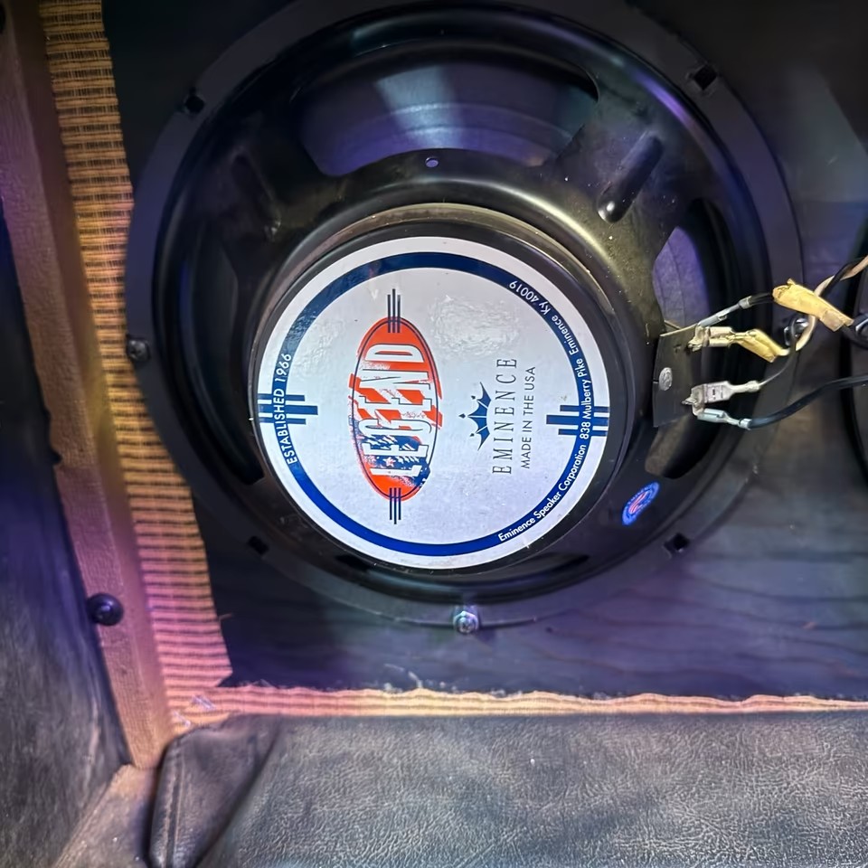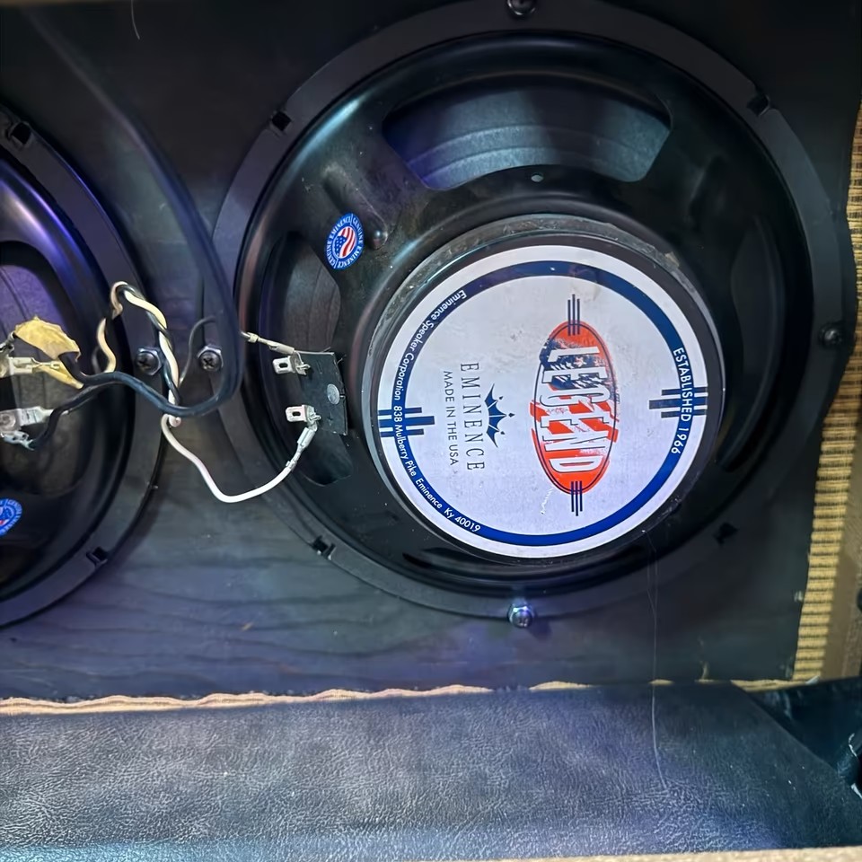 Die Potis funktionieren alle ohne zu kratzen, ebenso die Lautsprecher, hier sind 2 x 10″ Eminence Legend Ky40019 verbaut worden, die original Lautsprecher sind leider nicht mehr vorhanden!