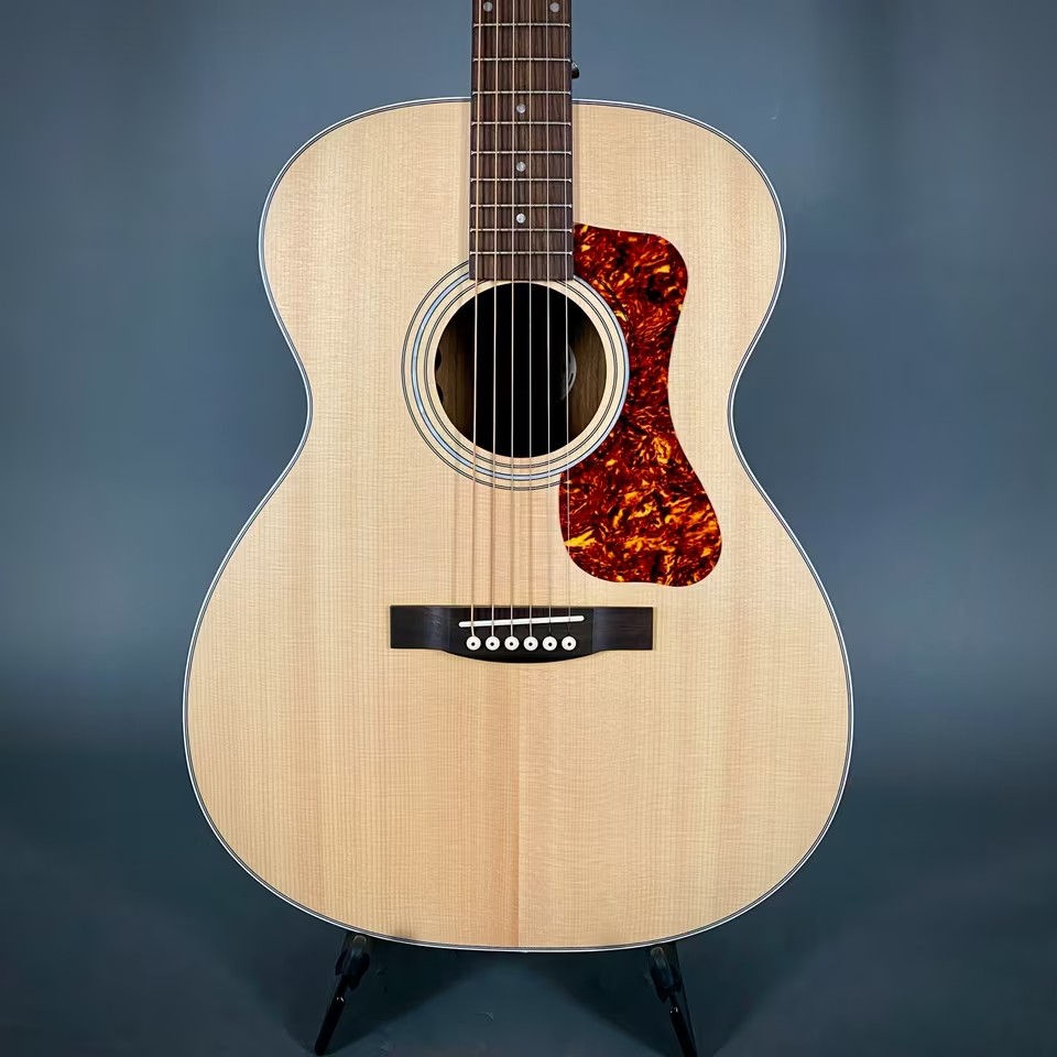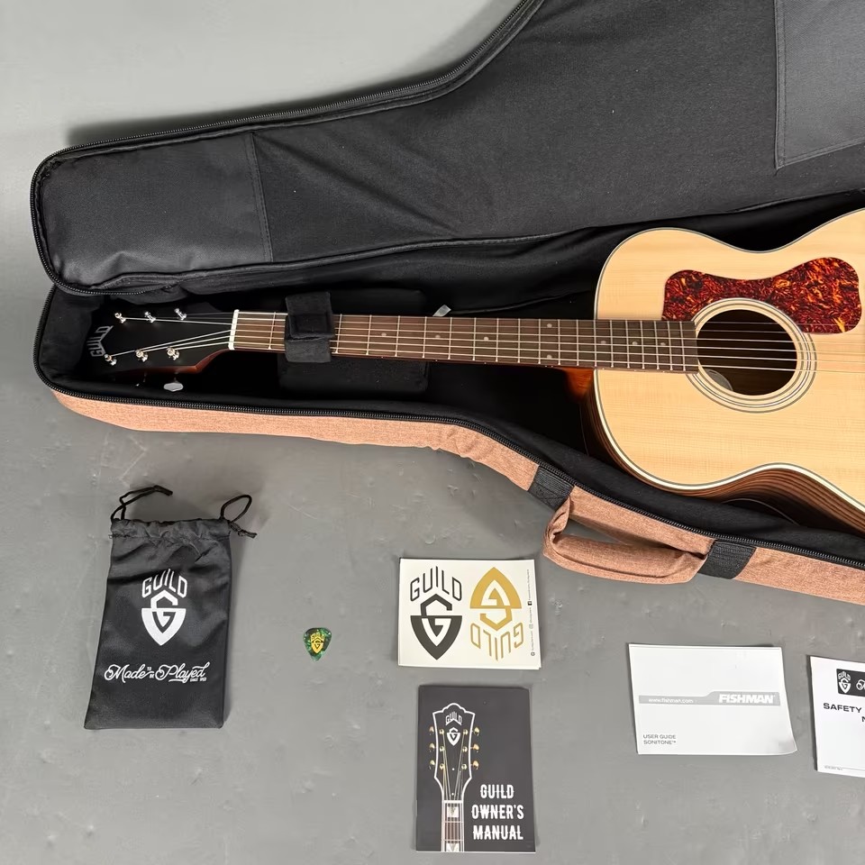 Die Guild OM-250E verfügt über klassische Designelemente, die von Spielern in der 70-jährigen Geschichte des Unternehmens geschätzt werden, und ist eine Akustikgitarre für Spieler mit einem unglaublich guten Preis-Leistungs-Verhältnis. Zu den Konstruktionsfeatures gehören eine massive Sitka-Fichtendecke mit Scalloped X-Bracing, ein Archback-Korpusdesign, Knochensattel und -stegeinlage, ein Guild x Fishman GT-1 Tonabnehmersystem und ein Tortoise-Schlagbrett.