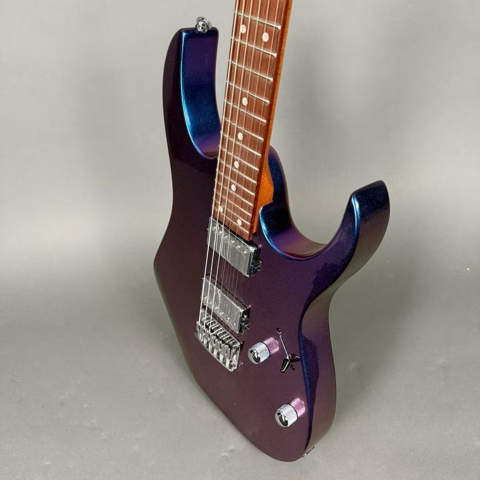 Je nach Blickwinkel wirkt die Gitarre Purple – Blue Metallic!