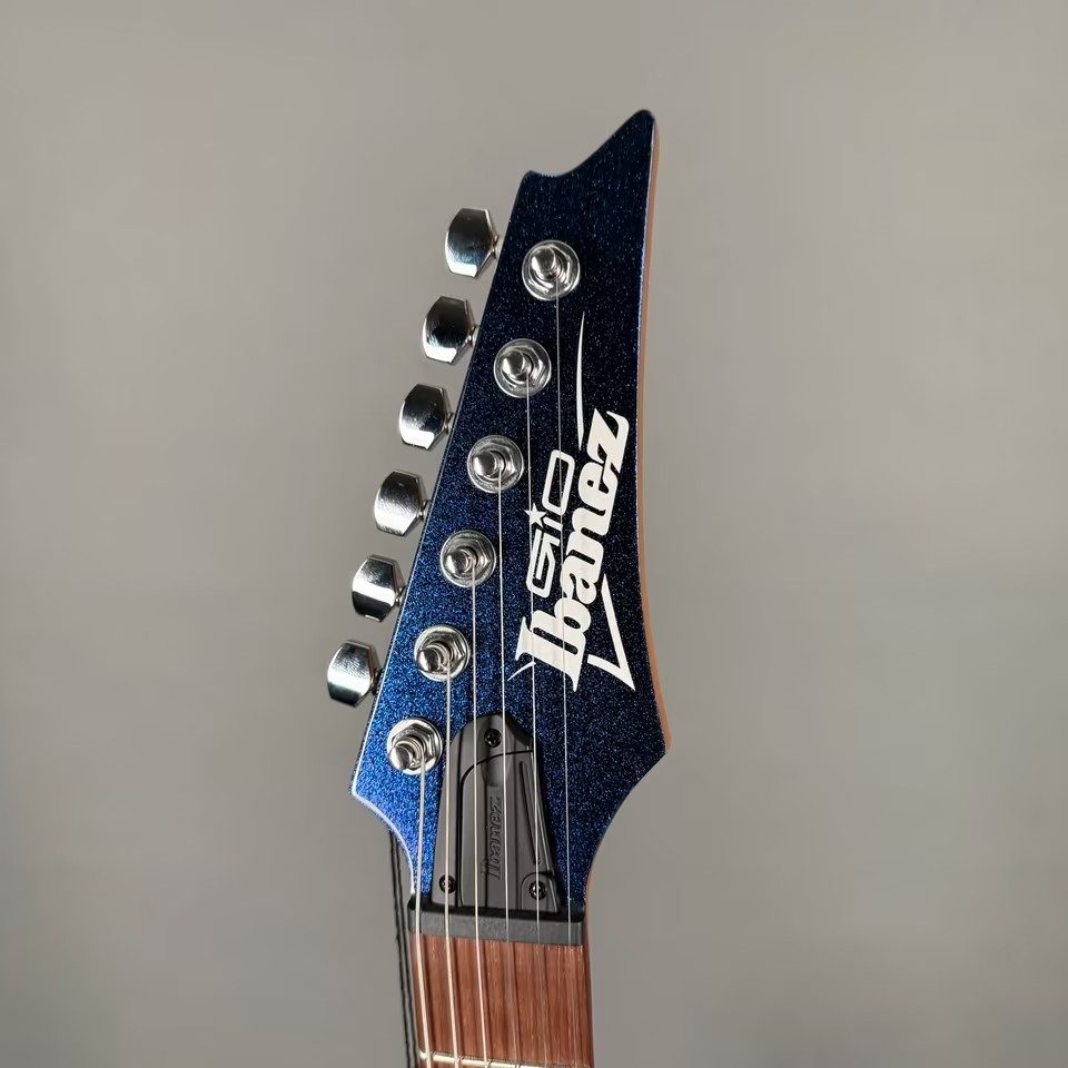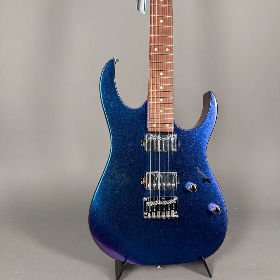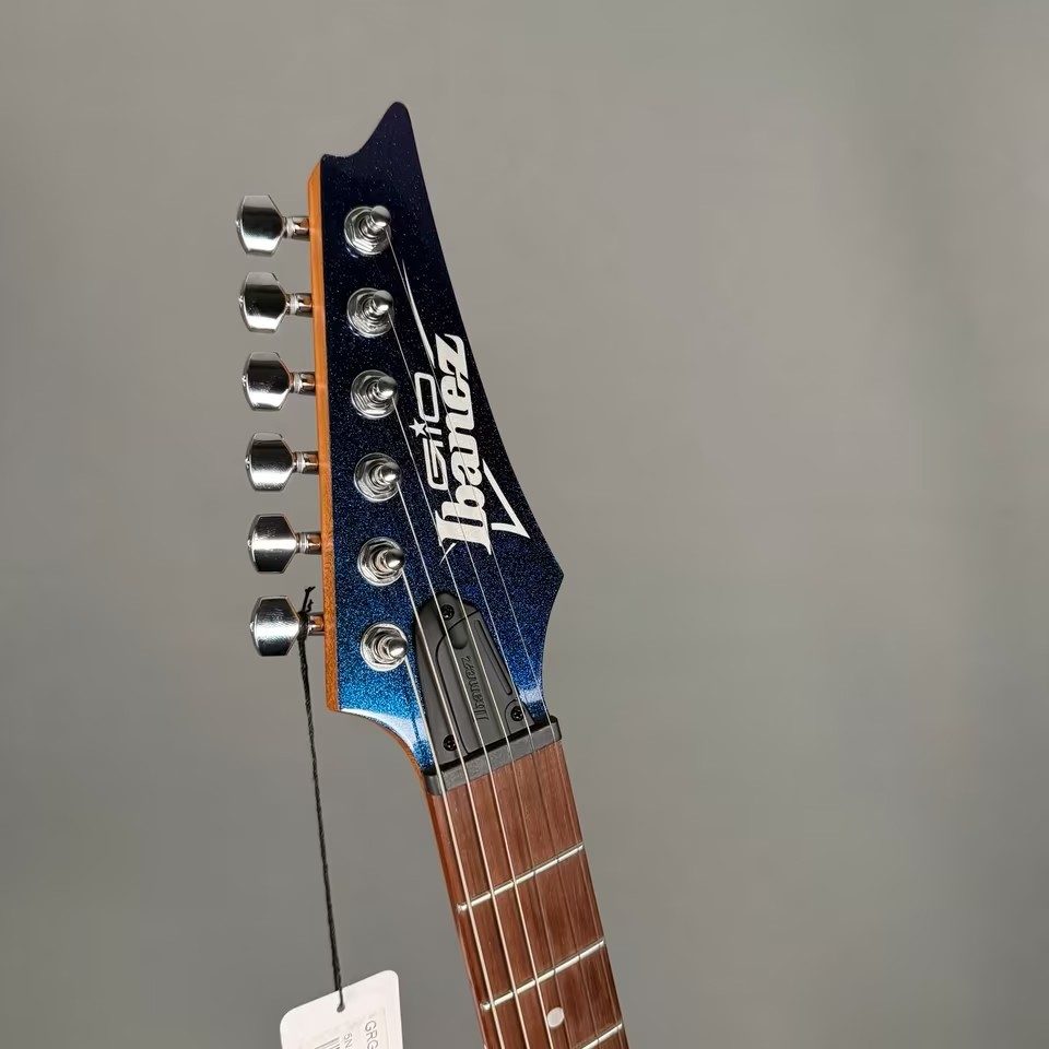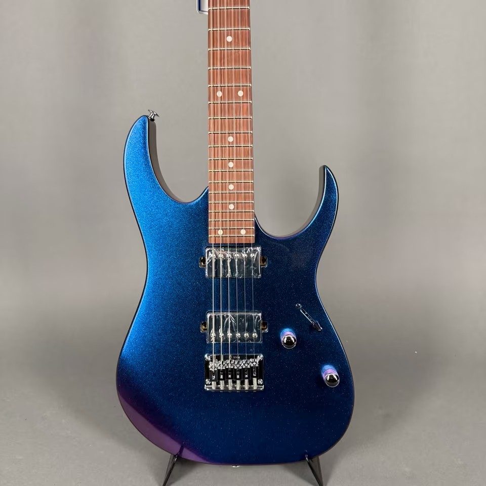 Die Ibanez Gio GRG121SP-BMC Blue Metal Chameleon ist eine durch und durch auf saftige Riffs und gnadenloses Shredding ausgelegte E-Gitarre aus der einsteigerfreundlichen Gio-Serie. Das Instrument im ikonischen RG-Design setzt auf gewohnt ergonomische Konturen ihres RG-Korpus aus Pappelholz und verfügt über einen wendigen Ibanez AANJ Halsfuß, der das Verbindungsstück zum gertenschlanken GRG-Hals aus geröstetem Ahorn bildet. Für die passenden klanglichen Argumente stehen hingegen zwei Ibanez Classic Elite Humbucker mit Nickel-Kappen bereit, welche dank 5-fach ausgeführtem Tonabnehmerwahlschalter mit interessanten Schaltkombinationen eine ungeheure Vielzahl potenzieller Sounds abzurufen wissen. Nicht zuletzt verfügt die Ibanez Gio GRG121SP-BMC über eine solide Ibanez F106 Brücke, Druckgussmechaniken und ein aufsehenerregendes Blue Metal Chameleon Finish mit Flop-Effekt.