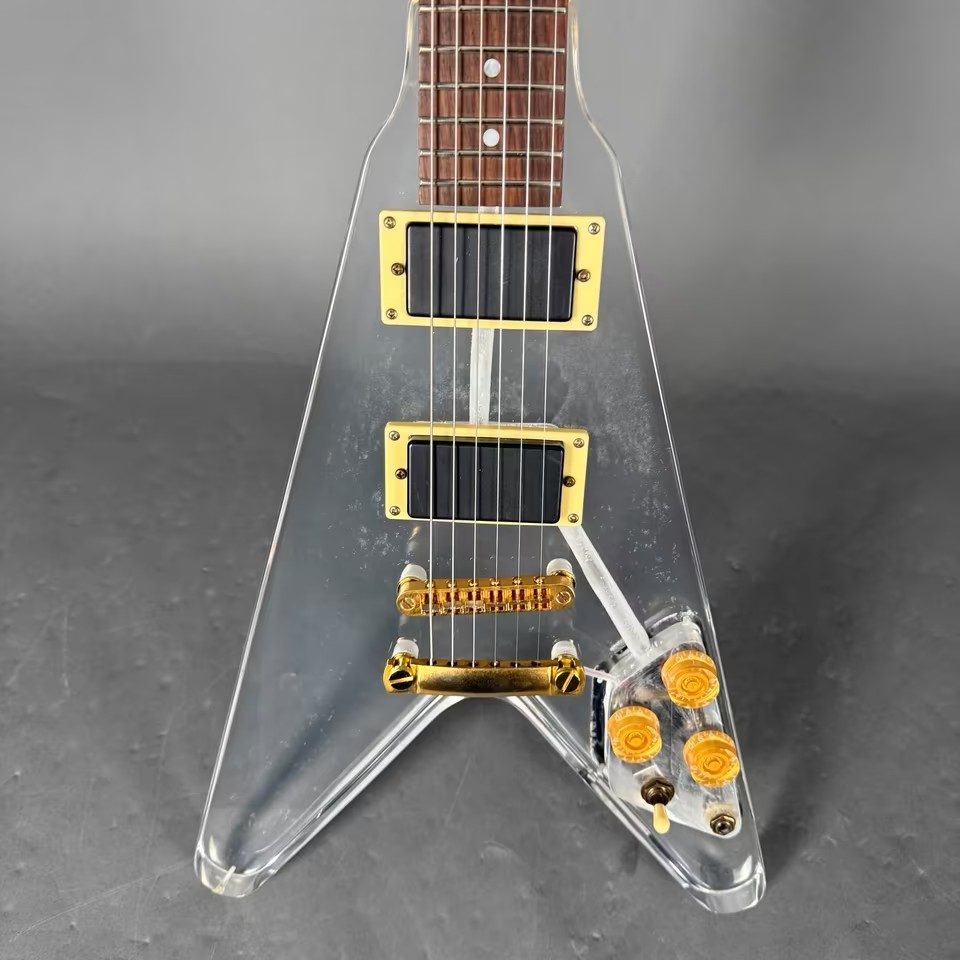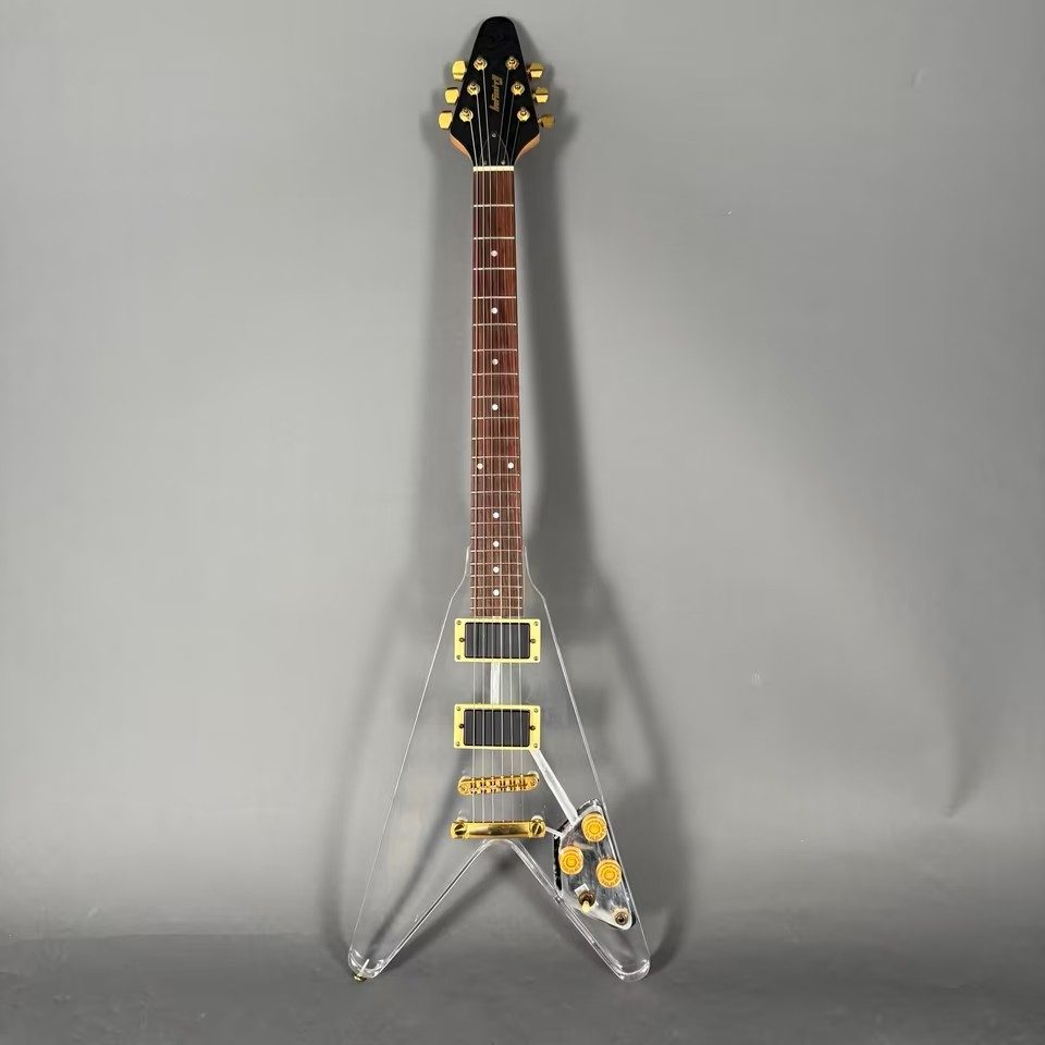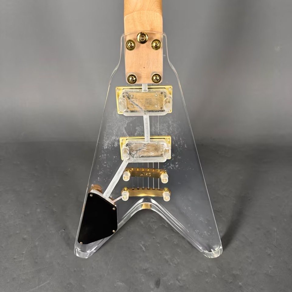 Hier eine coole E-Gitarre in Flying V Form aus dem Hause Infitity in Acryl mit Goldhardware… tolle Showgitarre!