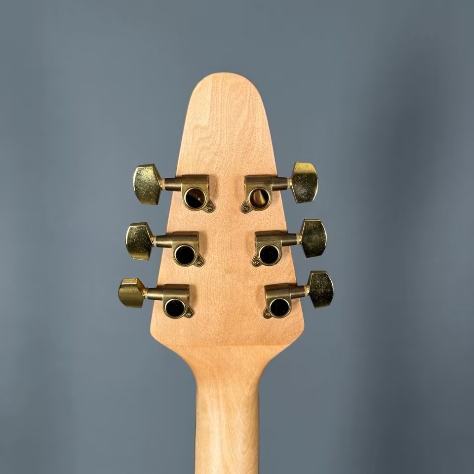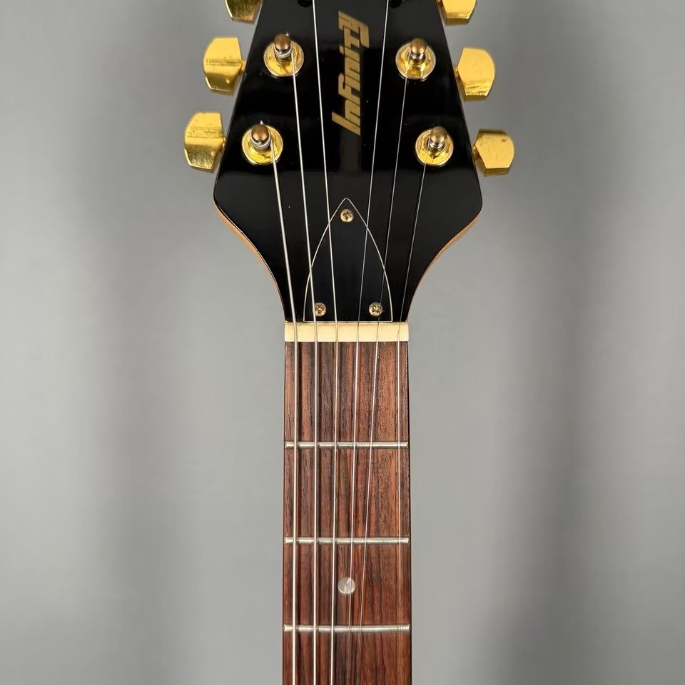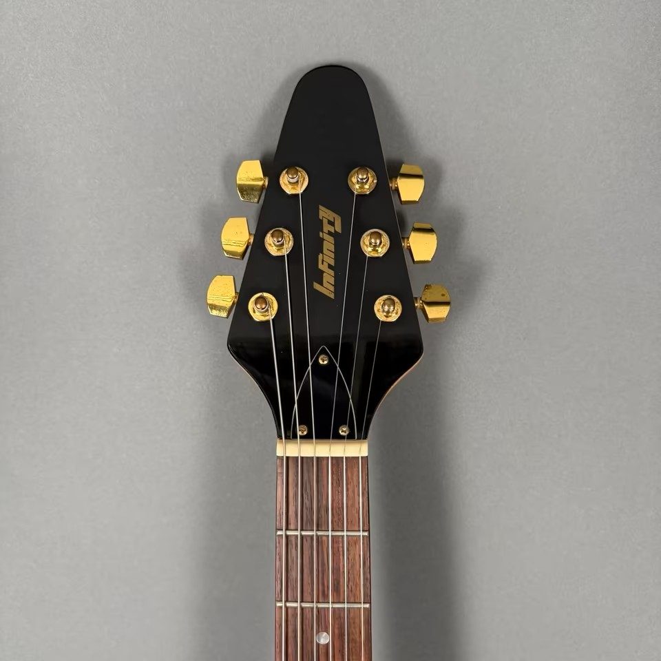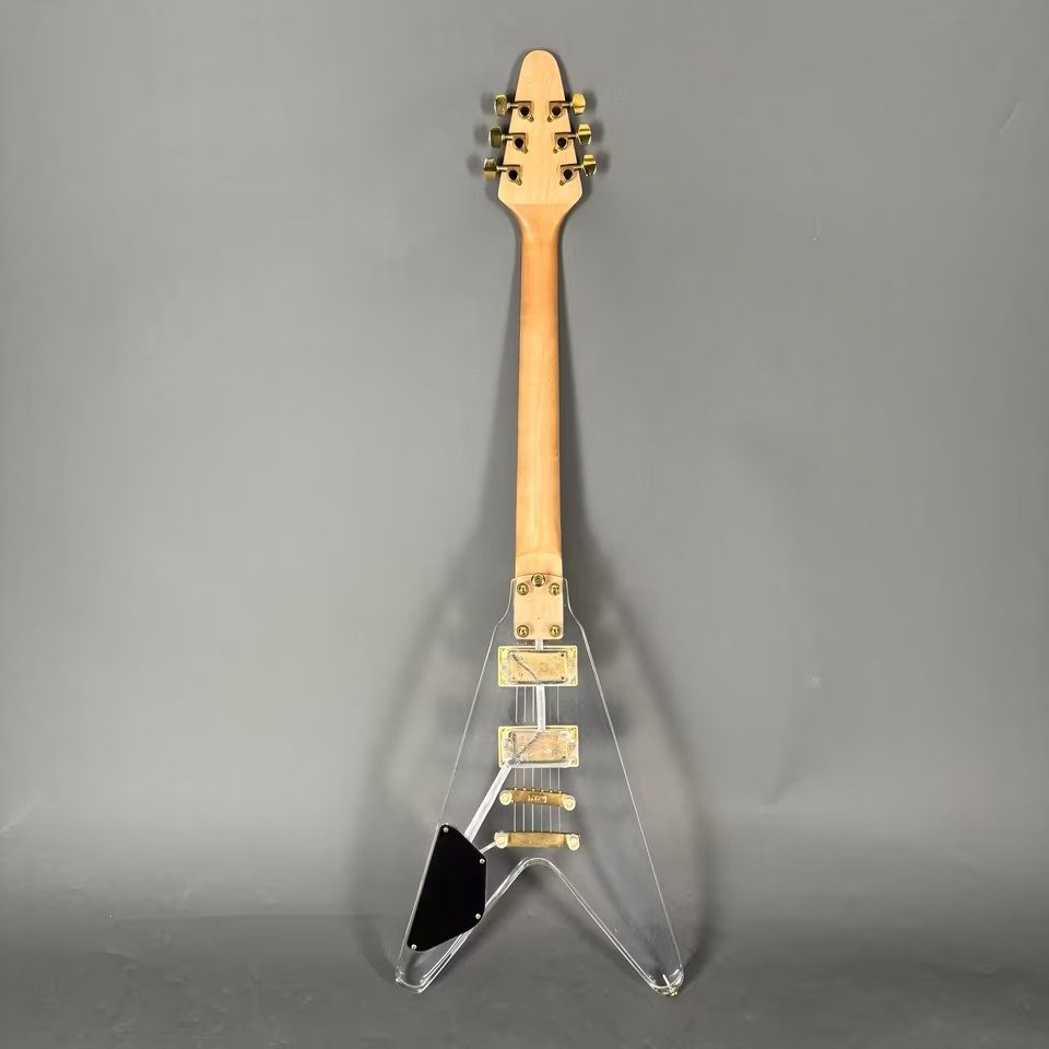 Hier eine coole E-Gitarre in Flying V Form aus dem Hause Infitity in Acryl mit Goldhardware… tolle Showgitarre!