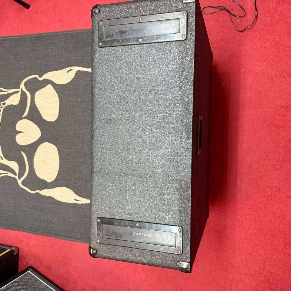 Hier eine 2 x 12″ Marshallbox Modell 1936, bestückt mit 2 x 12″ Dynacord Lautsprechern, auf Rollen – geordert bei Bo Winberg von „The Spotnicks“ gemeinsam mit dem Signature Amp und einem Alesis Quadraverb mit Bo Winbergs „Sounds of the Spotnicks“…