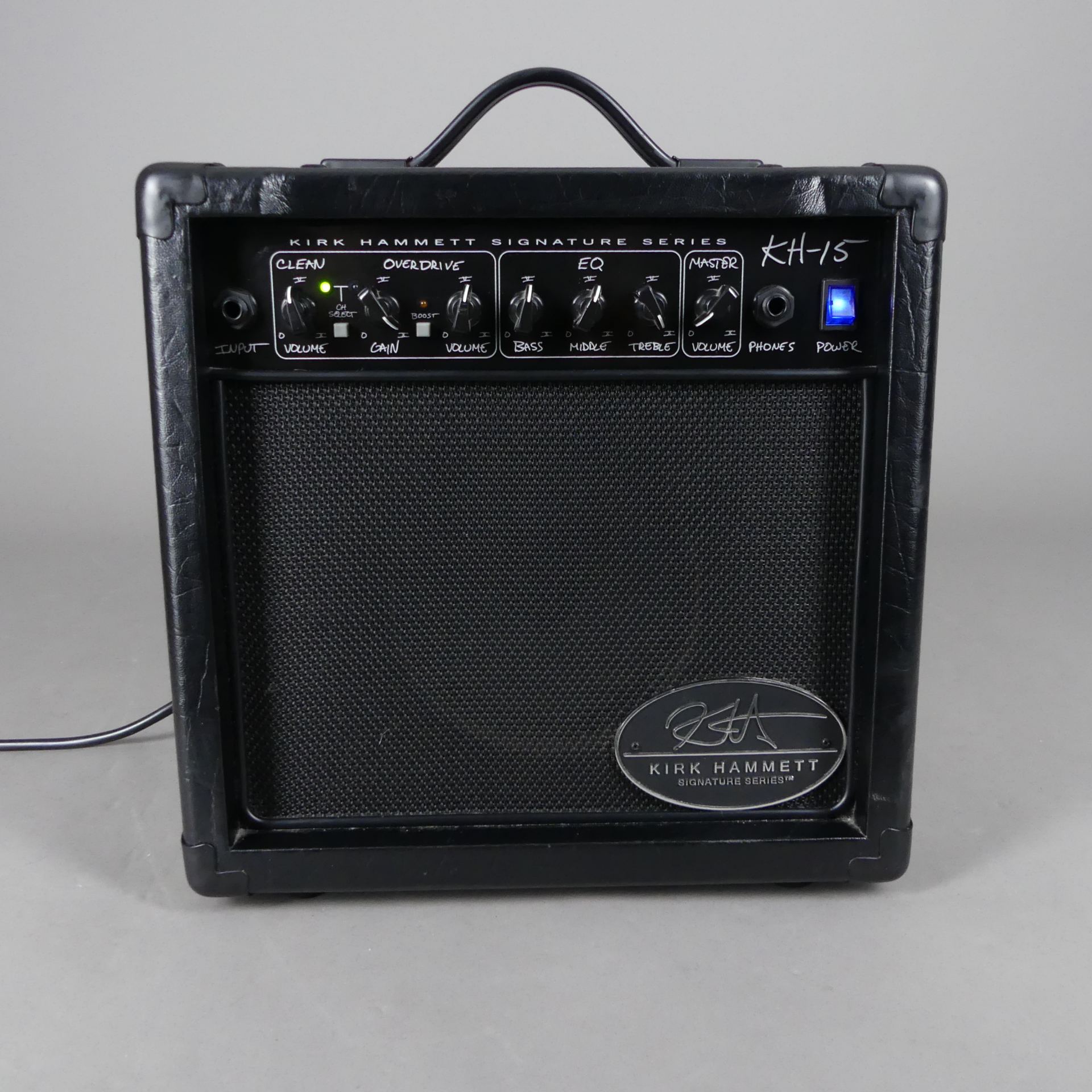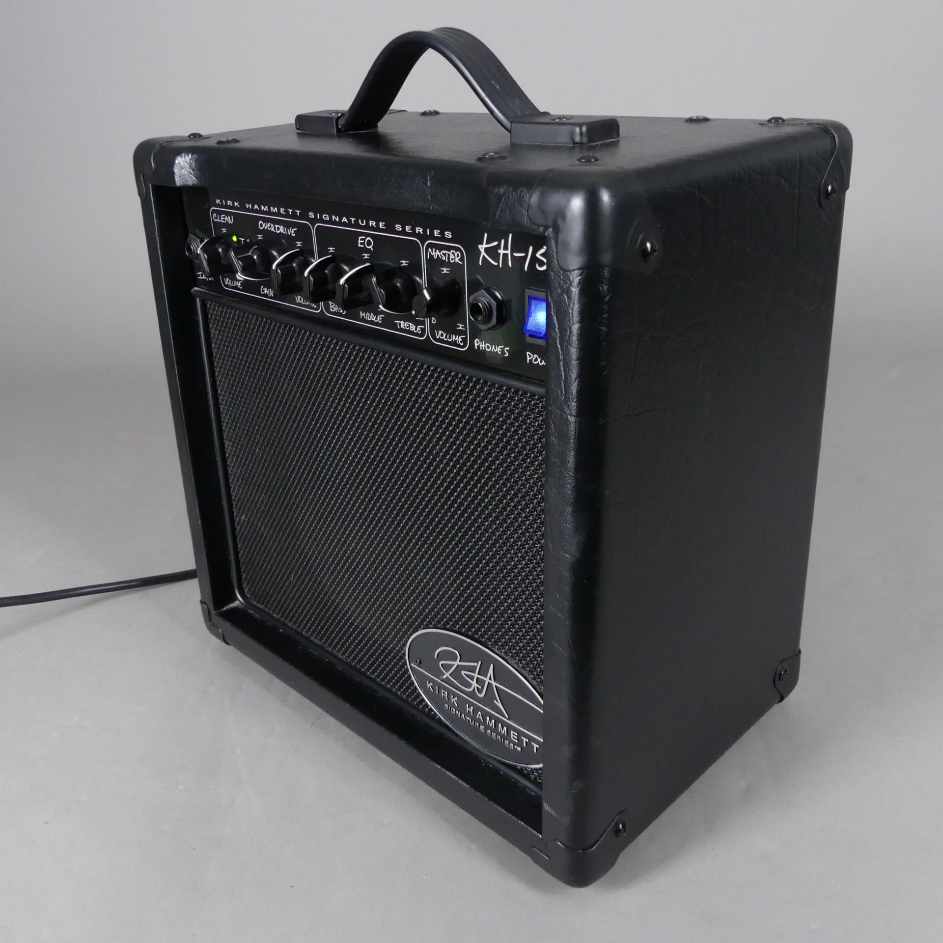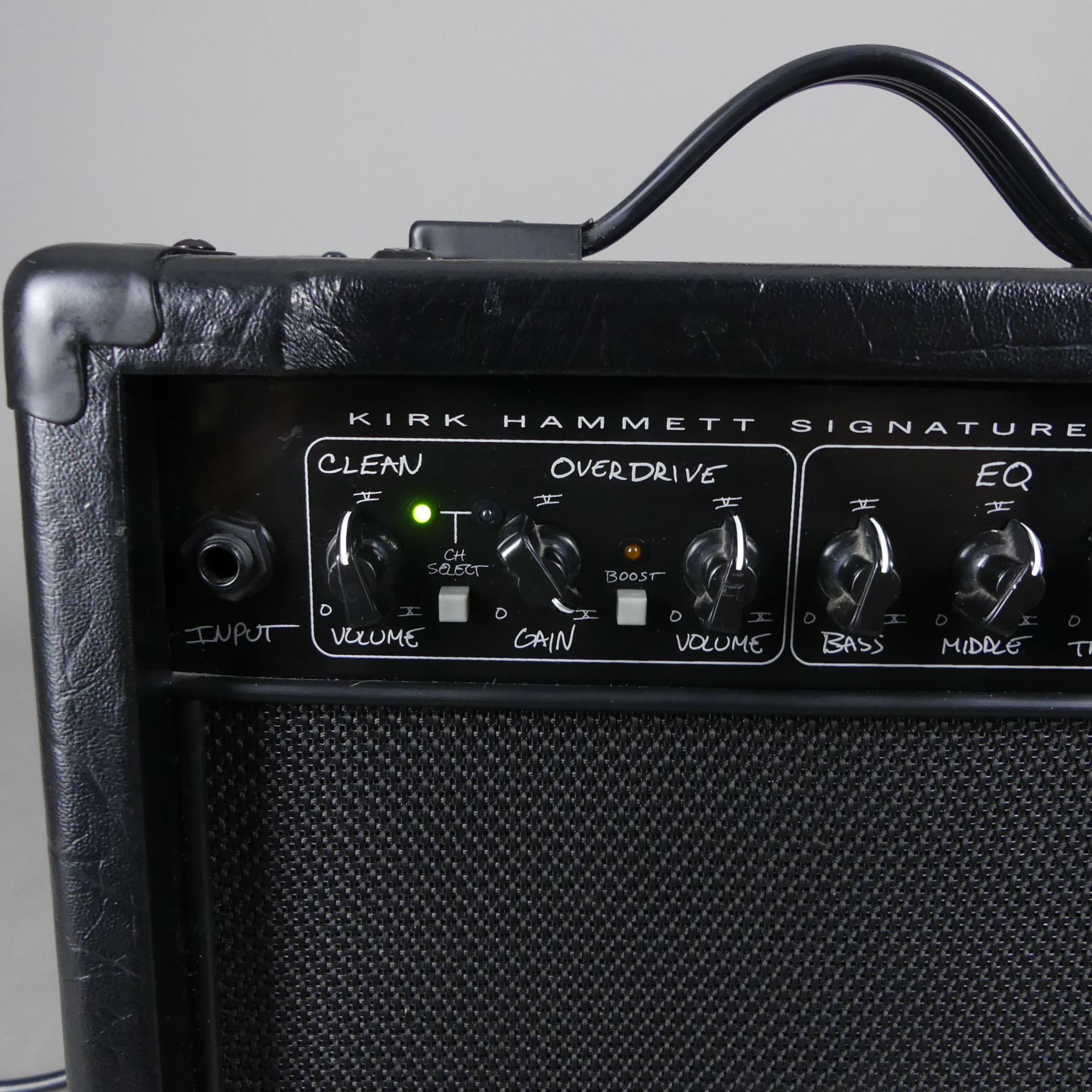 „Kirk Hammett Signature 15 watt practice combo with clean and overdrive channels, 3 band EQ, headphone jack and auxiliary input for CD or tape.“