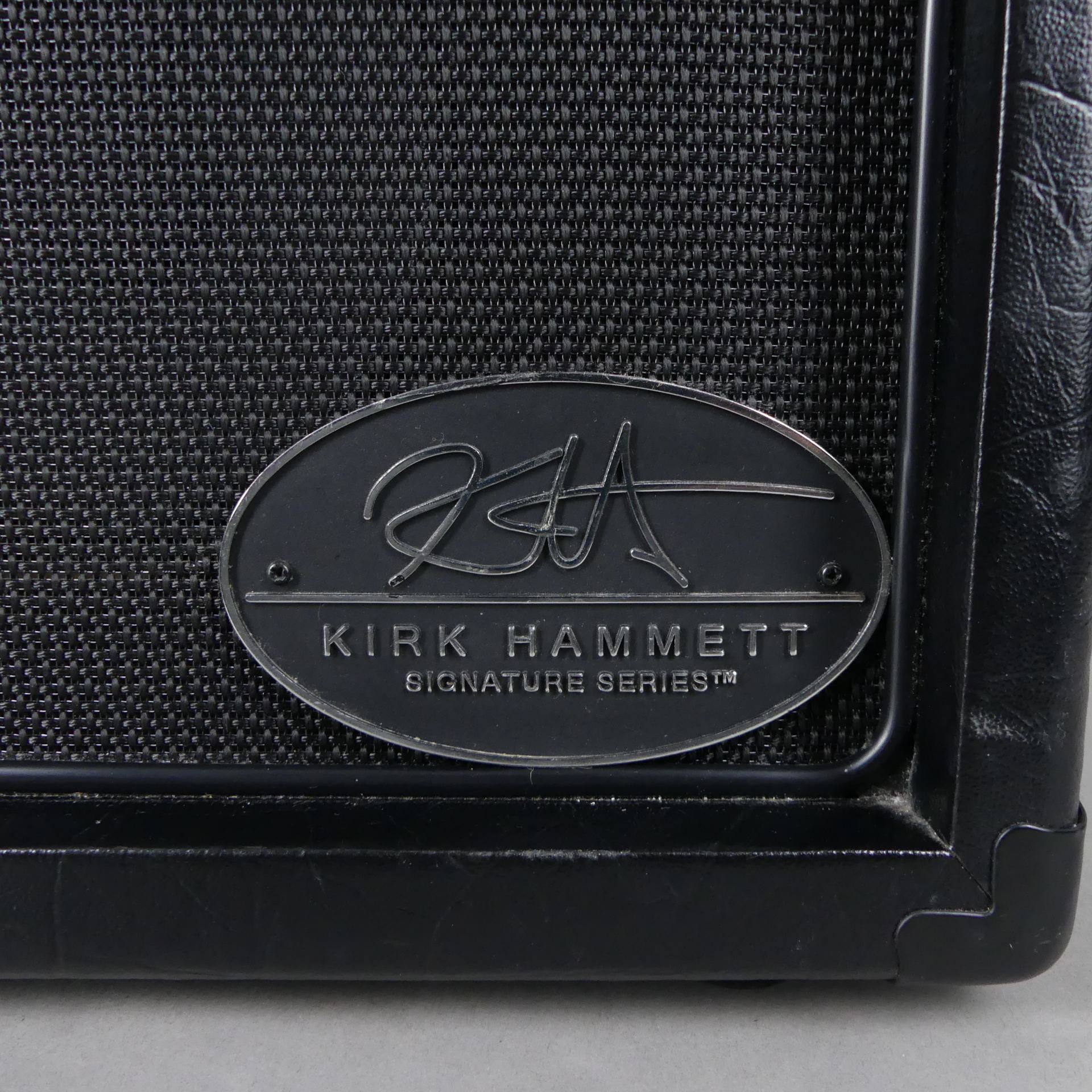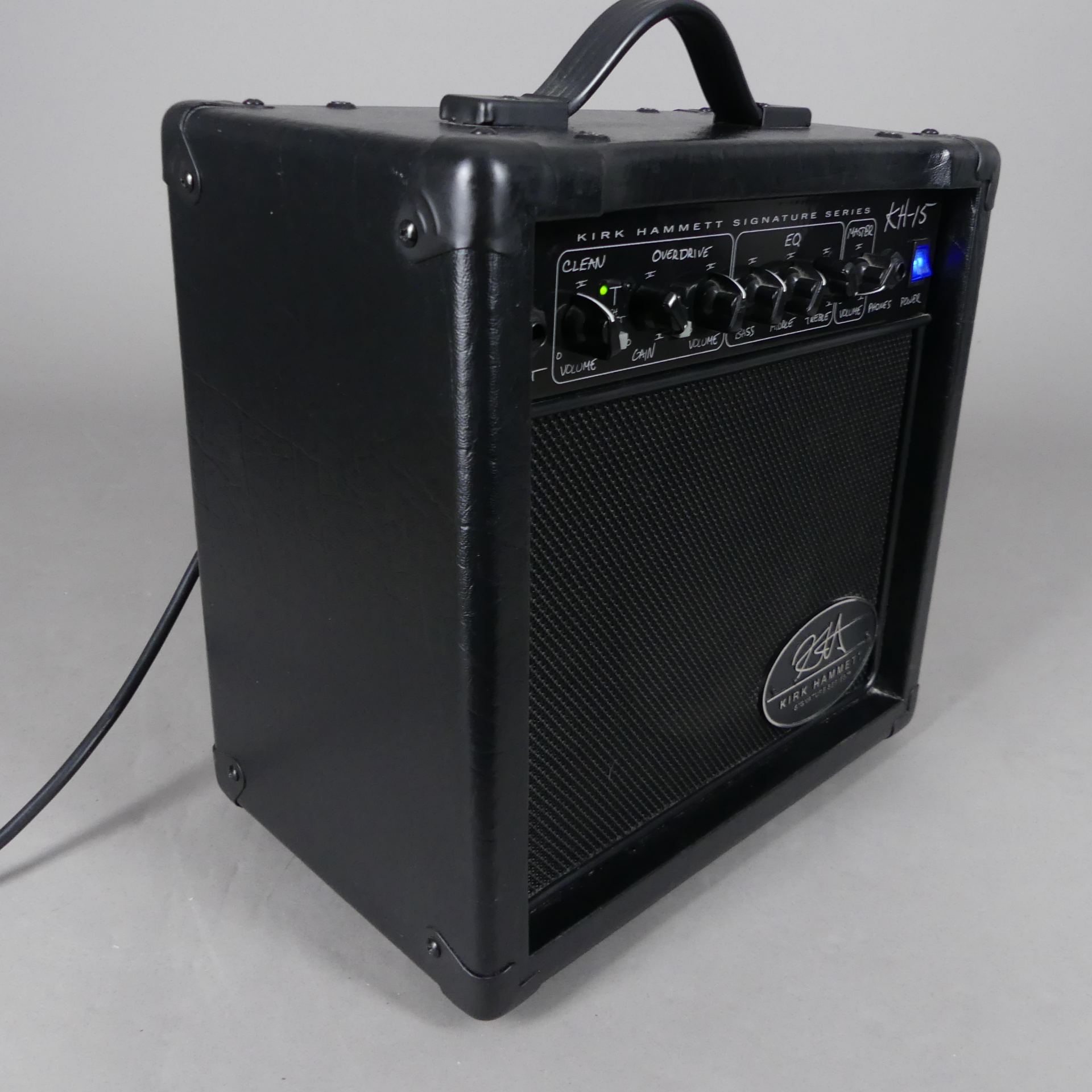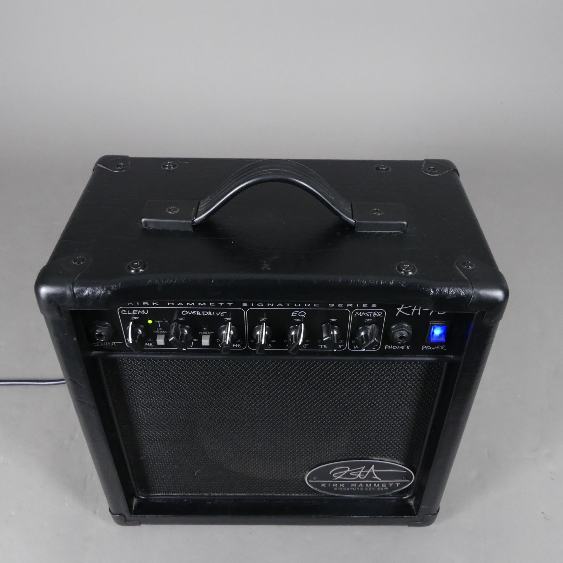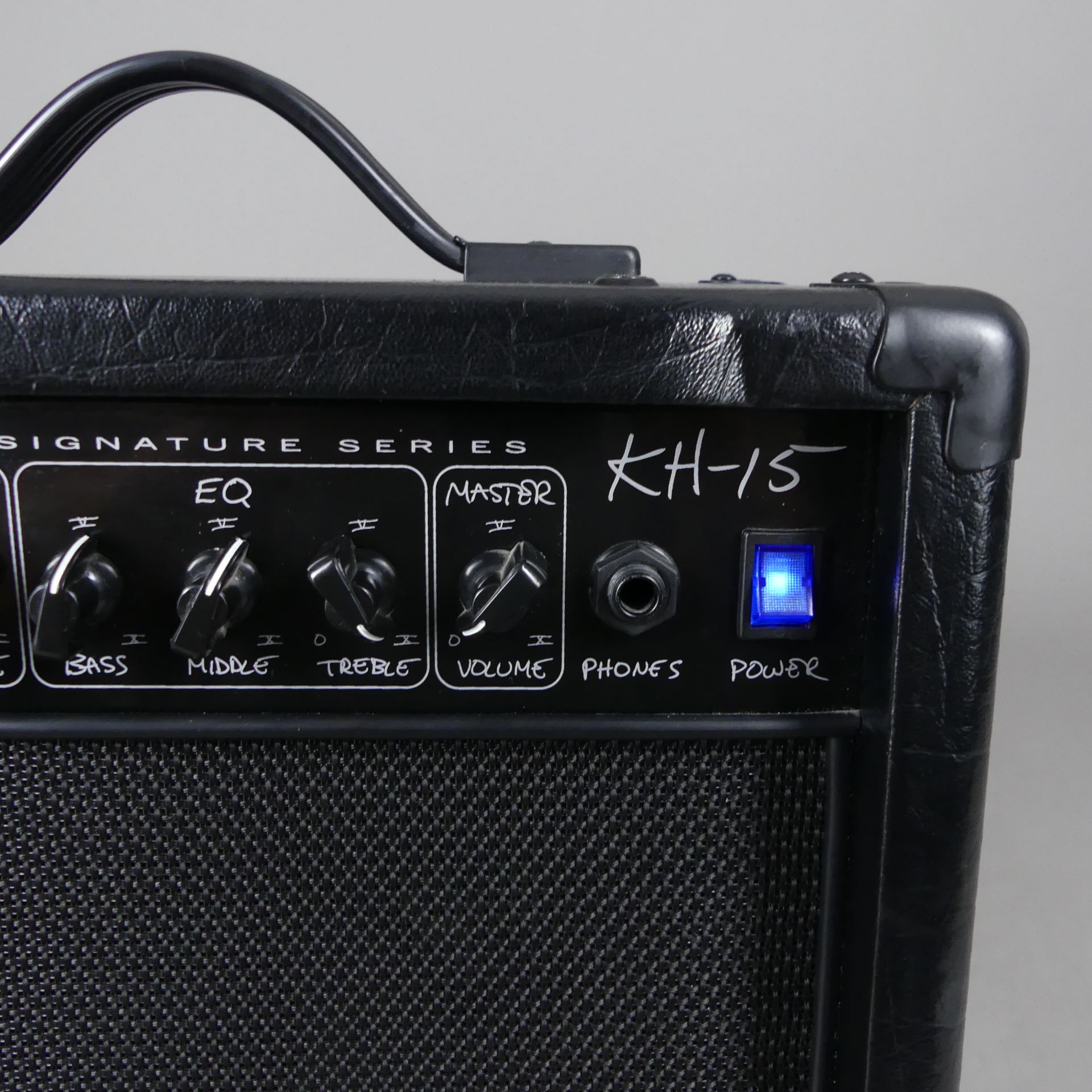 „Kirk Hammett Signature 15 watt practice combo with clean and overdrive channels, 3 band EQ, headphone jack and auxiliary input for CD or tape.“
