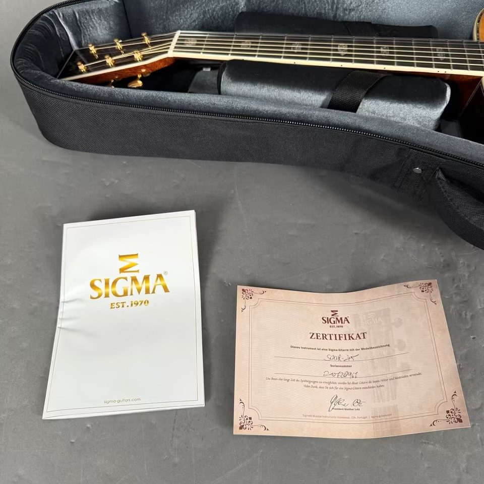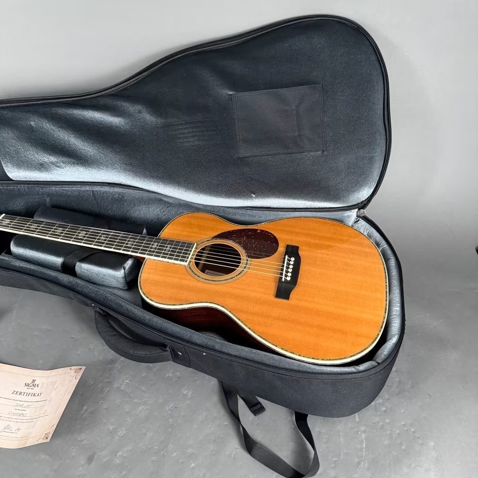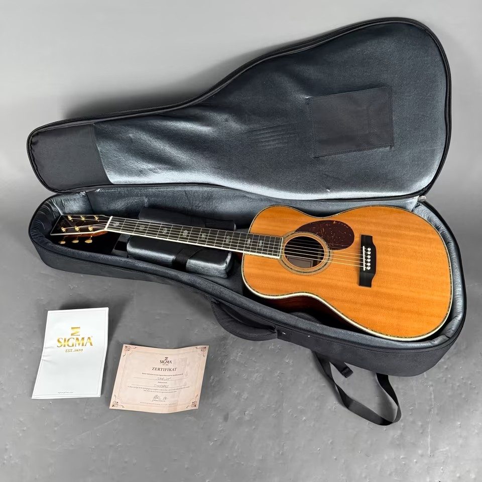 Hier eine absolut neuwertige Sigma SOMR-45 Westerngitarre, vollmassiv, in 000-14-Fret form, Sitka-Fichtendecke, Palisanderkorpus, Ebenholzgriffbrett, inklusive Softcase